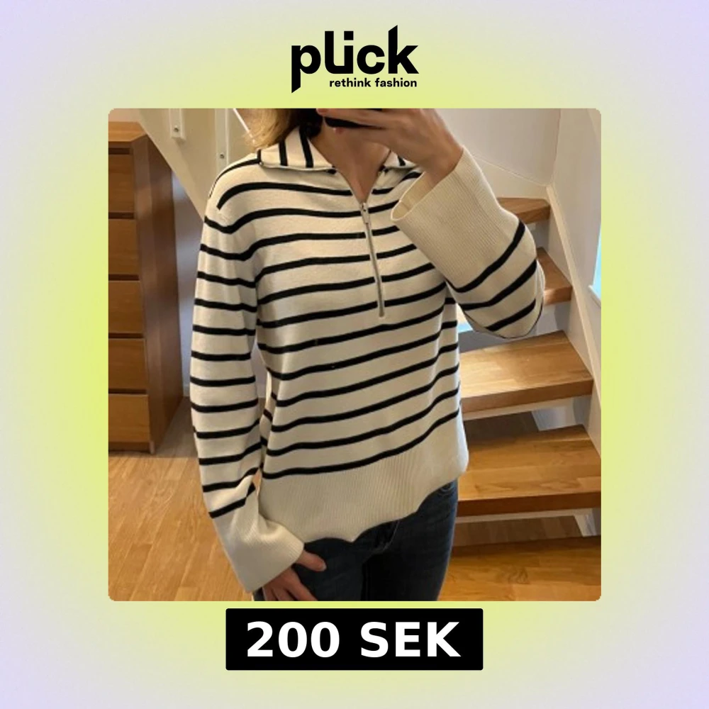 Snygg stickad tröja från KappAhl i vitt med mörkblåa ränder. Tröjan har en halv dragkedja framtill, krage och långa ärmar med breda muddar. Perfekt för lager-på-lager till hösten/vintern🤍