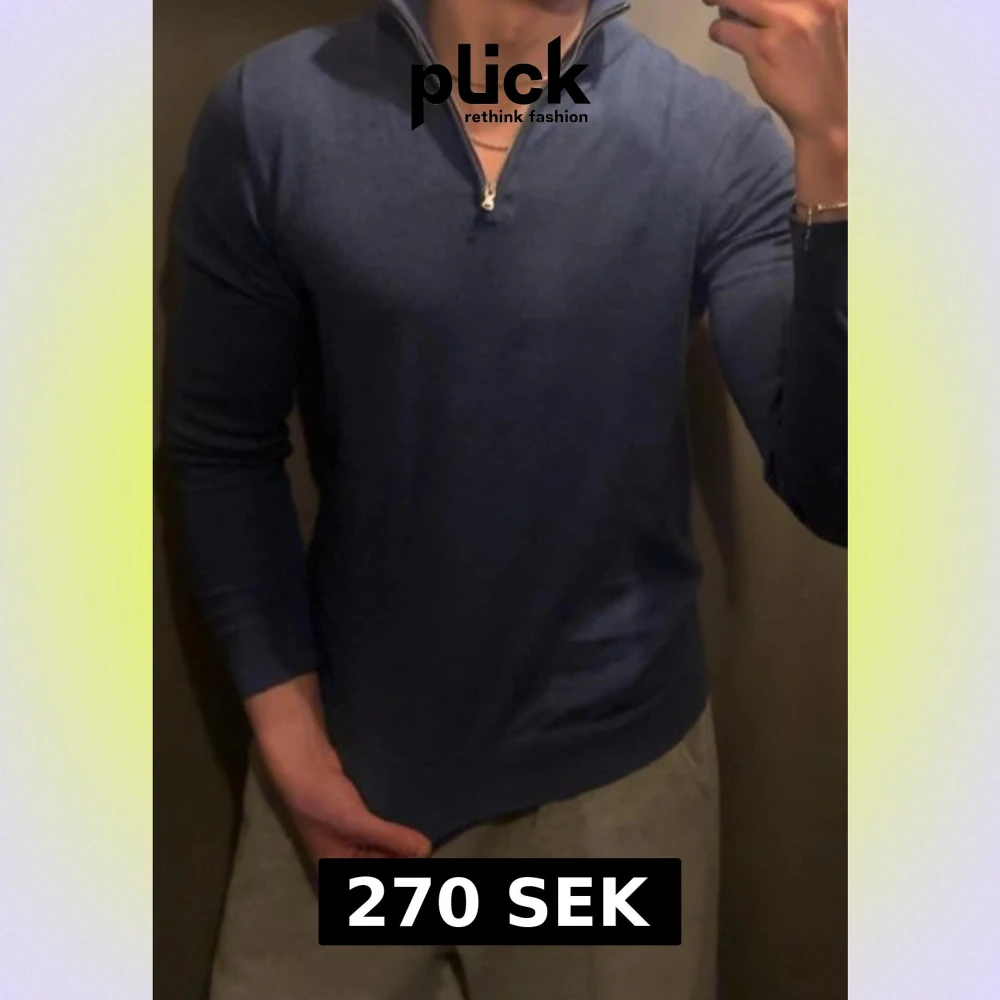 Snygg blå långärmad tröja från Dressmann med half zip och ståkrage. Tröjan är i mjukt stickat material och har en normal passform som sitter skönt. Perfekt för dig som gillar stilrena och enkla plagg med lite sportig vibe.