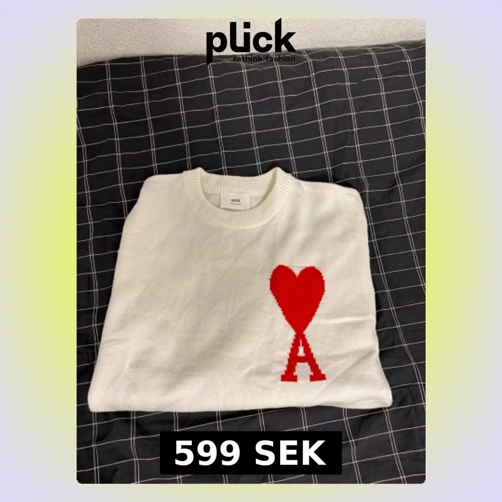Vit stickad tröja från Ami med ett stort rött hjärta och bokstaven A på bröstet. Tröjan har rund hals, långa ärmar och breda ribbade muddar vid ärmslut och nederkant. Perfekt för dig som gillar stilrena plagg med en twist. Bara testad på annars i nyskick, inga defekter. Hör av dig om du har några frågor.:) behöver få såldt snabbt så kan gå ner till 500 vid snabb affär