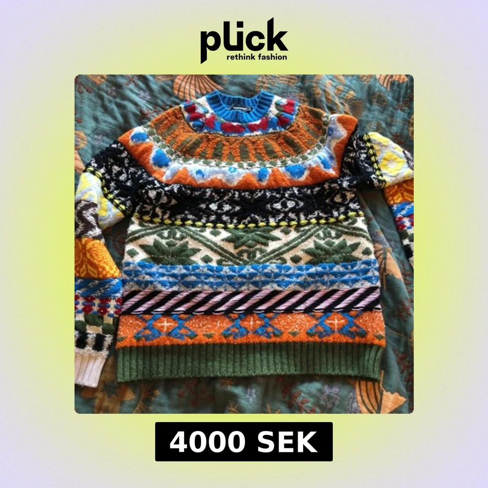 Stickad tröja från Dsquared2 i storlek M. Tröjan har ett färgstarkt multifärgat mönster. Rund halsringning och långärmad modell. Ursprungspris 9500 kr.