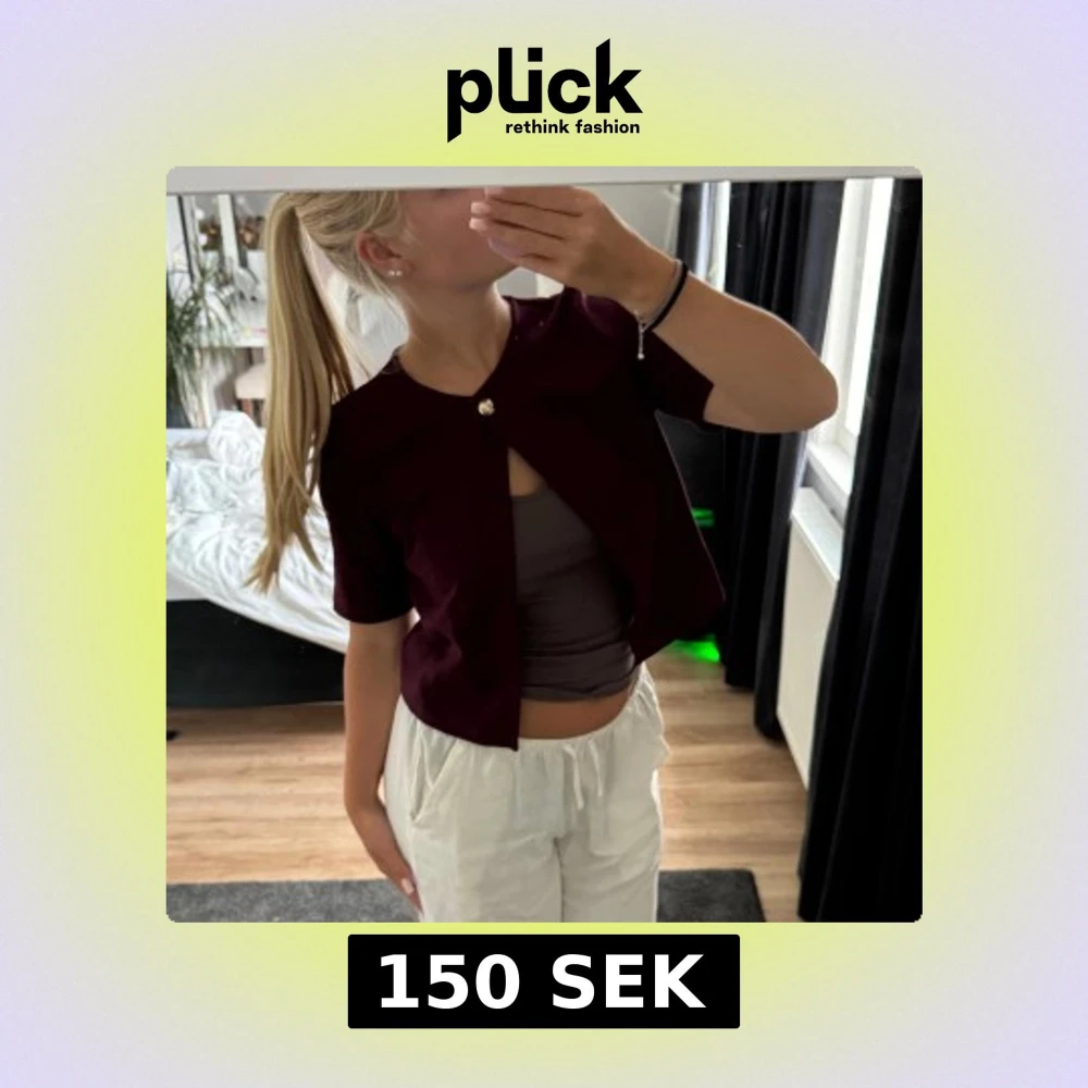 Kortärmad vinröd cardigan jacka från Gina Tricot med rund halsringning och en dekorativ guldig knapp framtill. Jackan är croppad och har en enkel, stilren design som passar perfekt till lager-på-lager. Mjuk och bekväm i bomullsmix.