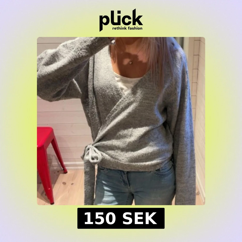 Mysig grå omlottkofta med knytband i midjan och lång ärm. Koftan har en v-ringad front och är gjord i ett mjukt stickat material.