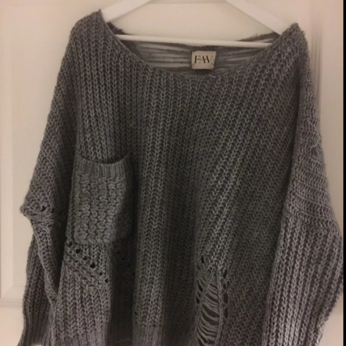Grå stickad Louis Vuitton tröja - Snygg grå stickad tröja från Louis Vuitton med stort vitt LV-logo framtill. Tröjan har rund hals, ribbade muddar och långärmad passform. Perfekt för dig som gillar exklusiva märken och vill ha en stilren look.