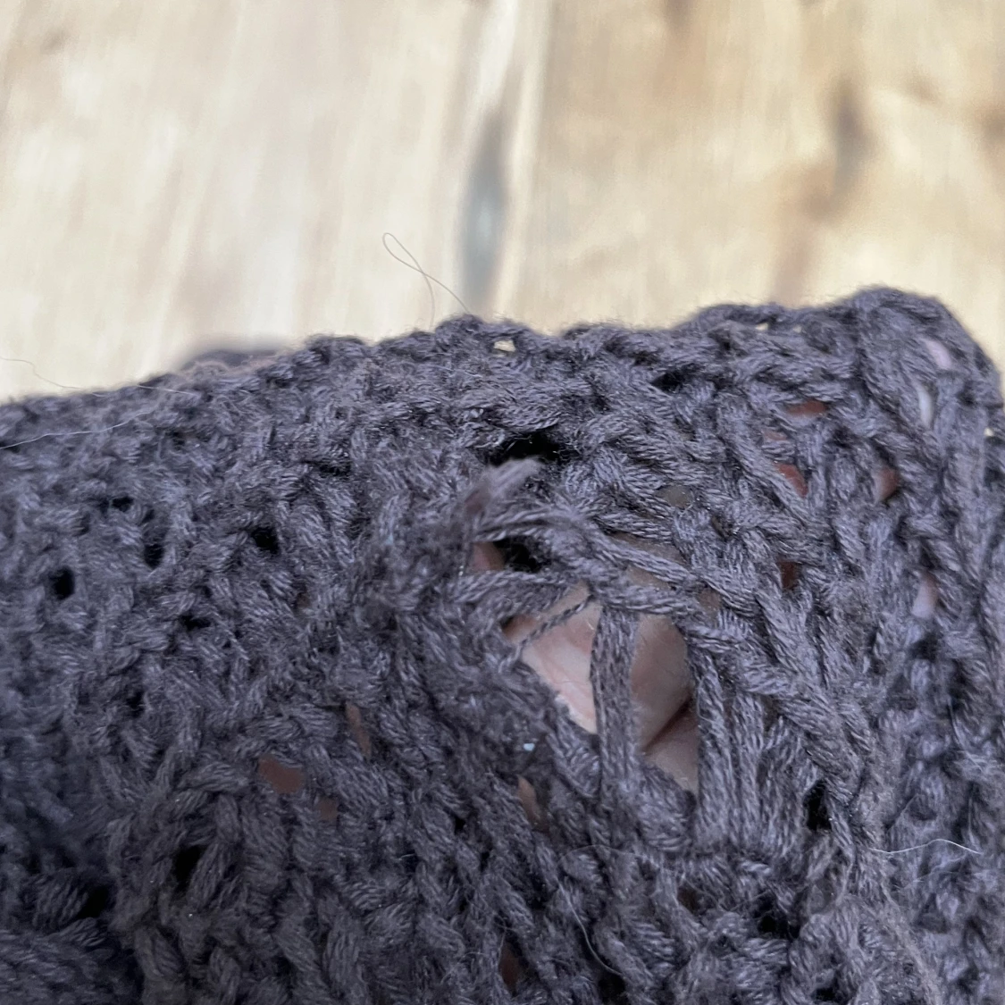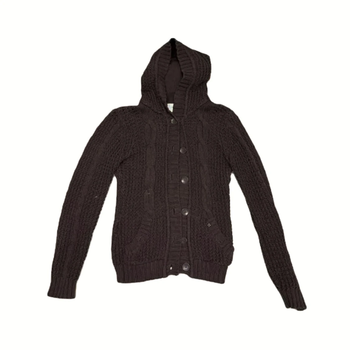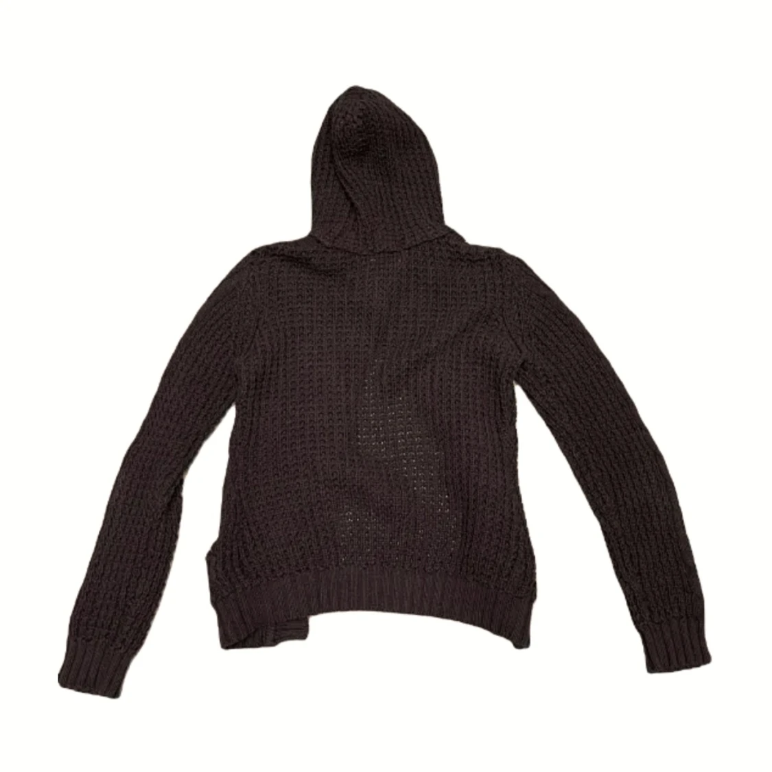 Najs stickad kofta med luva. Det syns inte supertydligt men den är brun. Den har ett litet hål i axeln •köparen står för frakten