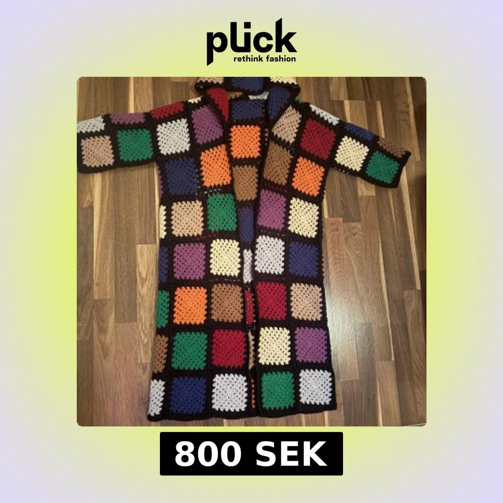 Unik och färgglad lång cardigan jacka med virkade rutor i olika färger som grönt, lila, blått, rött, orange och beige. Jackan har lång ärm och öppen framtill, perfekt för dig som gillar retro och boho vibes. Supermysig att slänga på sig när det är lite kyligt.