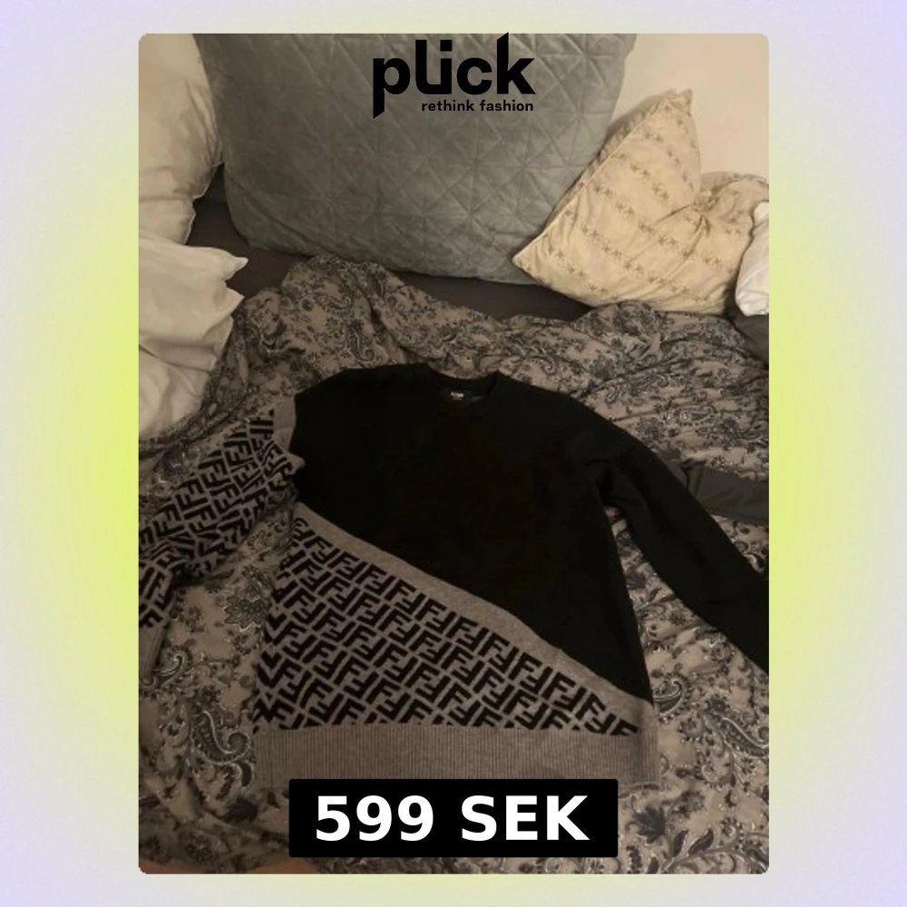 Säljer en stickad tröja från Fendi i svart och grått med det klassiska Fendi-mönstret på ena ärmen och nedre delen av tröjan. Tröjan har rund halsringning och ribbade muddar. Perfekt för dig som gillar exklusiva märken och unik design.