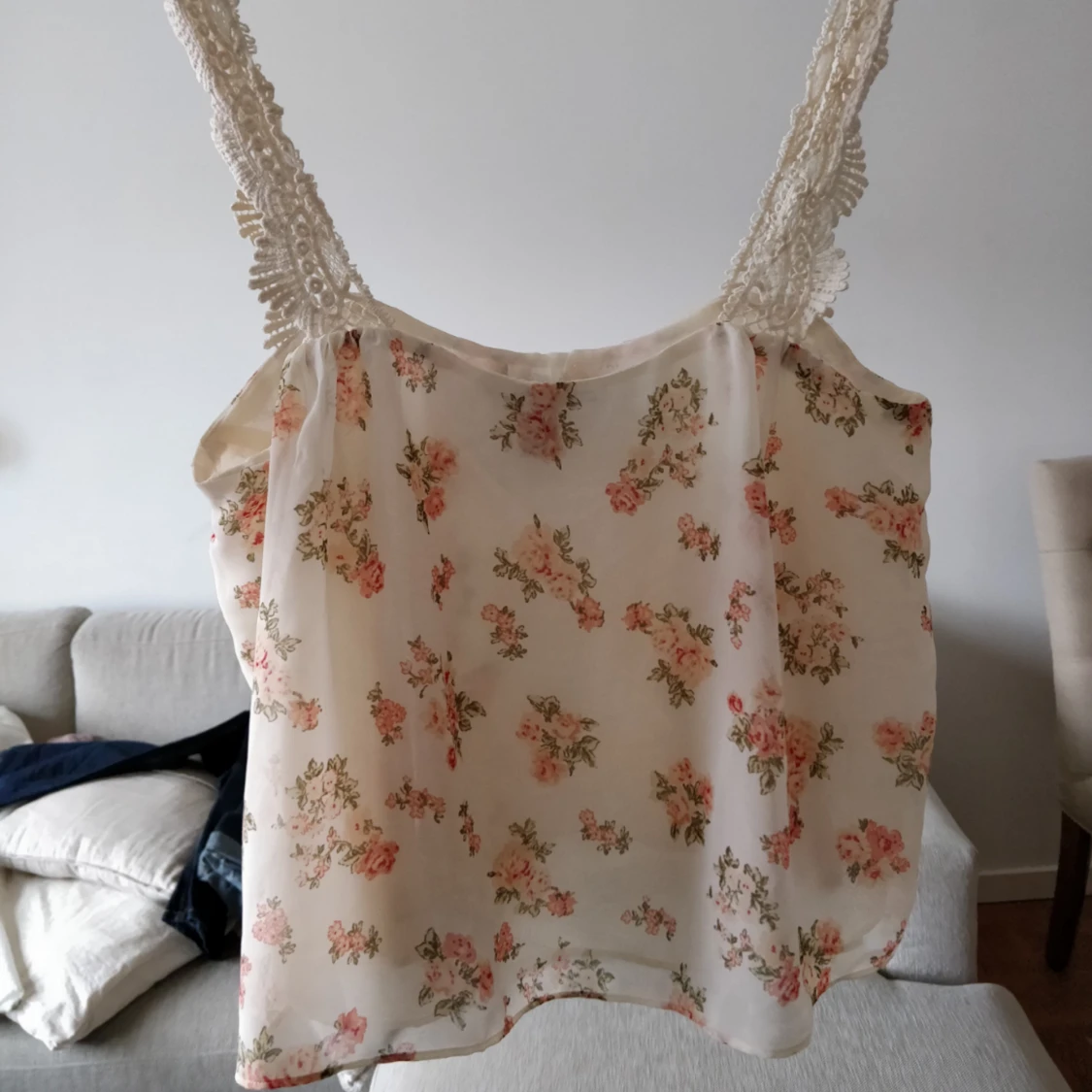 Superfin croptop från F21. Köpt i London. Strl S men den hade nog passat allt från XS till M, svårt att säga. Kort topp med fint mönster och broderade/stickade axelband. Tunt, fint och skirt material. Perfekt till sommaren. Skriv vid frågor! :)