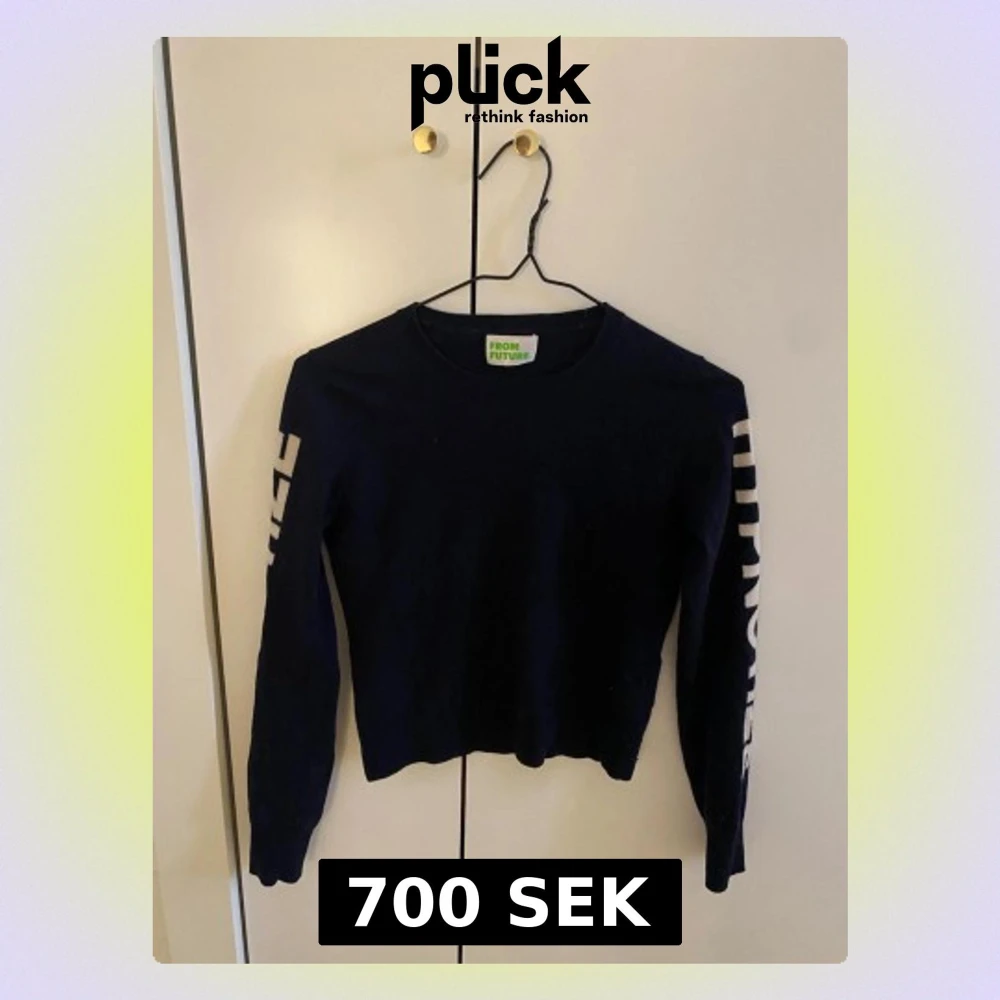 Mörkblå stickad tröja från From Future med rund hals och långa ärmar. Tröjan har vita grafiska detaljer längs båda ärmarna (står hypnotize) Perfekt för dig som gillar en enkel men ändå cool look. Materialet känns mjukt och bekvämt. Storlek xs/xxs