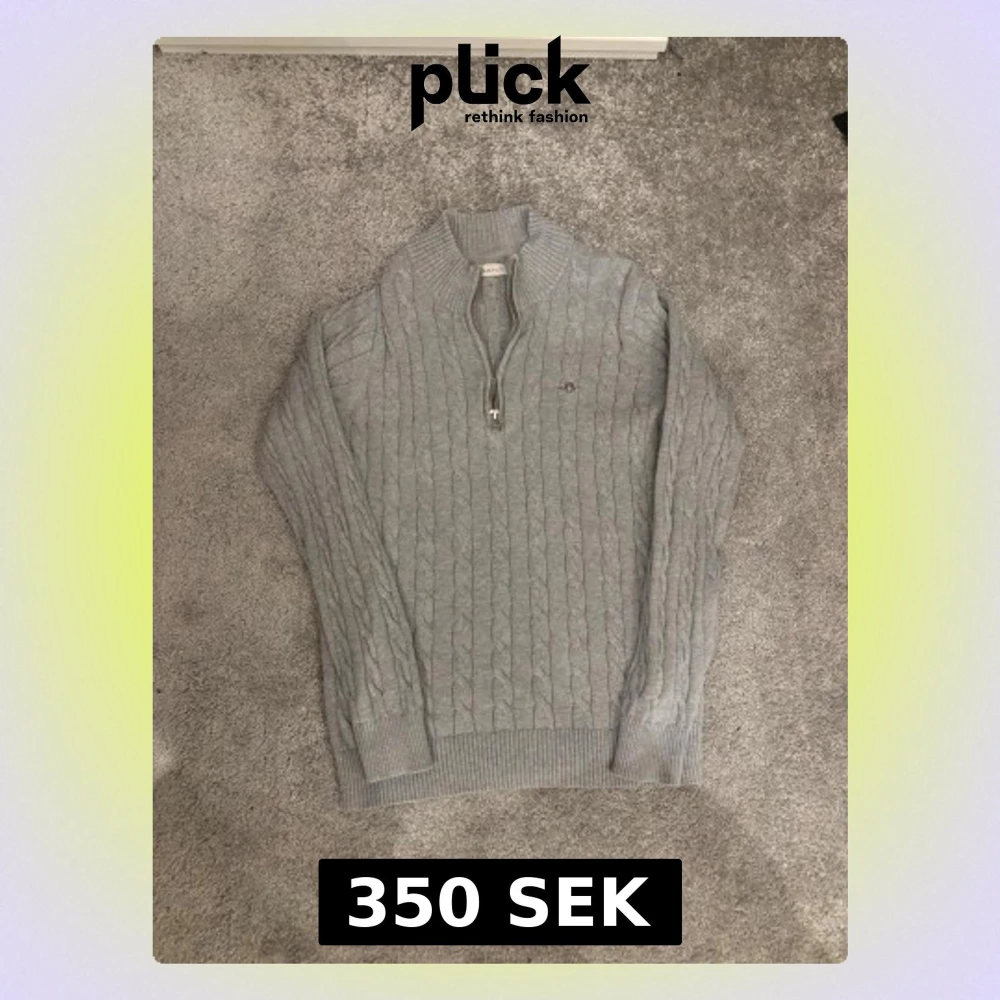 Snygg grå kabelstickad tröja från GANT med halv dragkedja och hög krage. Tröjan har ribbade muddar och ett litet broderat GANT-logo på bröstet. Perfekt för lager-på-lager och passar till det mesta.