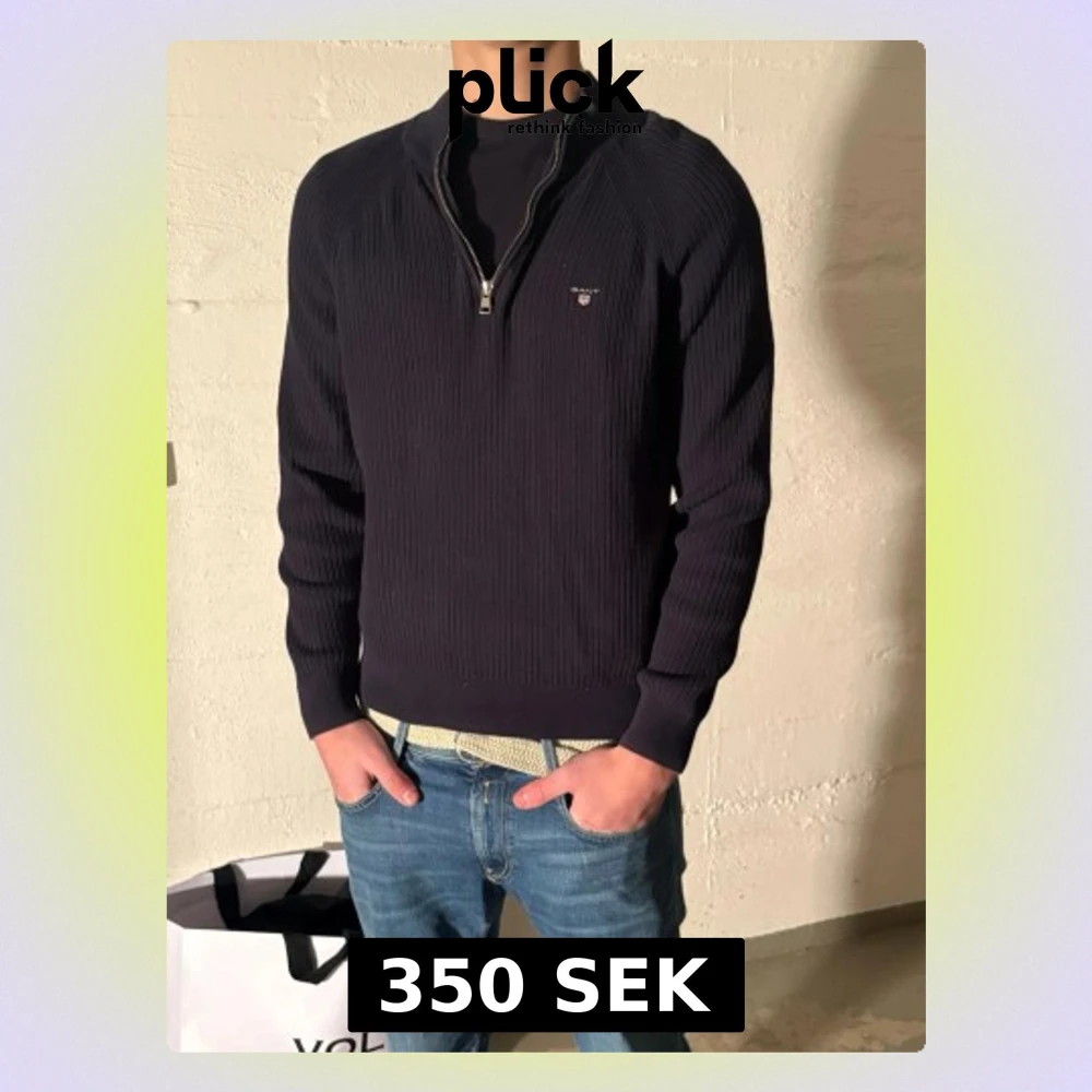 Snygg mörkblå stickad tröja från Gant med halv dragkedja och diskret logga på bröstet. Tröjan har ribbad struktur, långa ärmar och en klassisk passform. Perfekt till jeans för en clean och stilren look. Modellen är 188 cm och väger ca 76 kilo