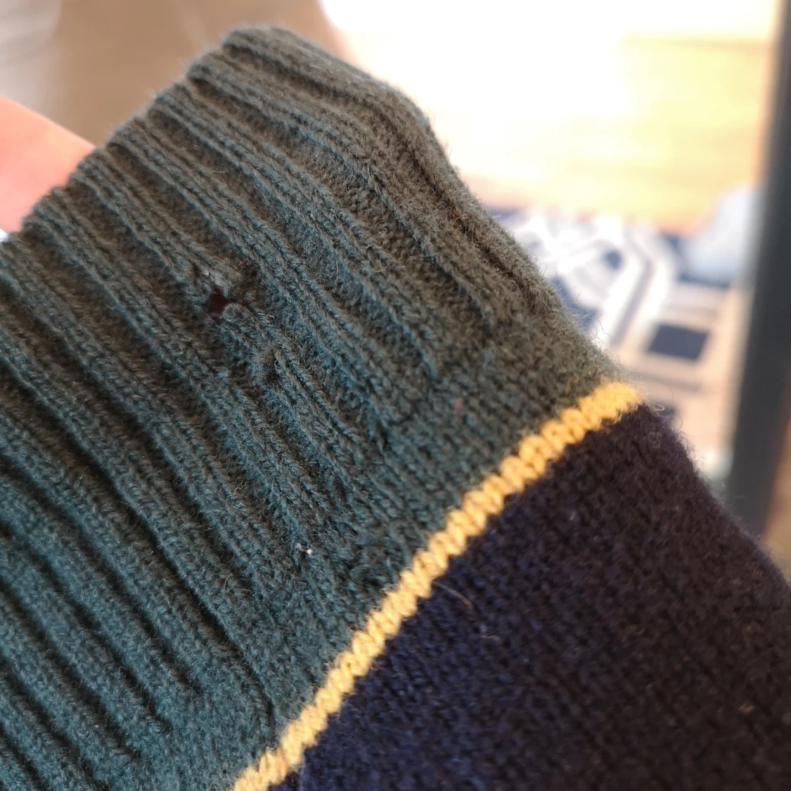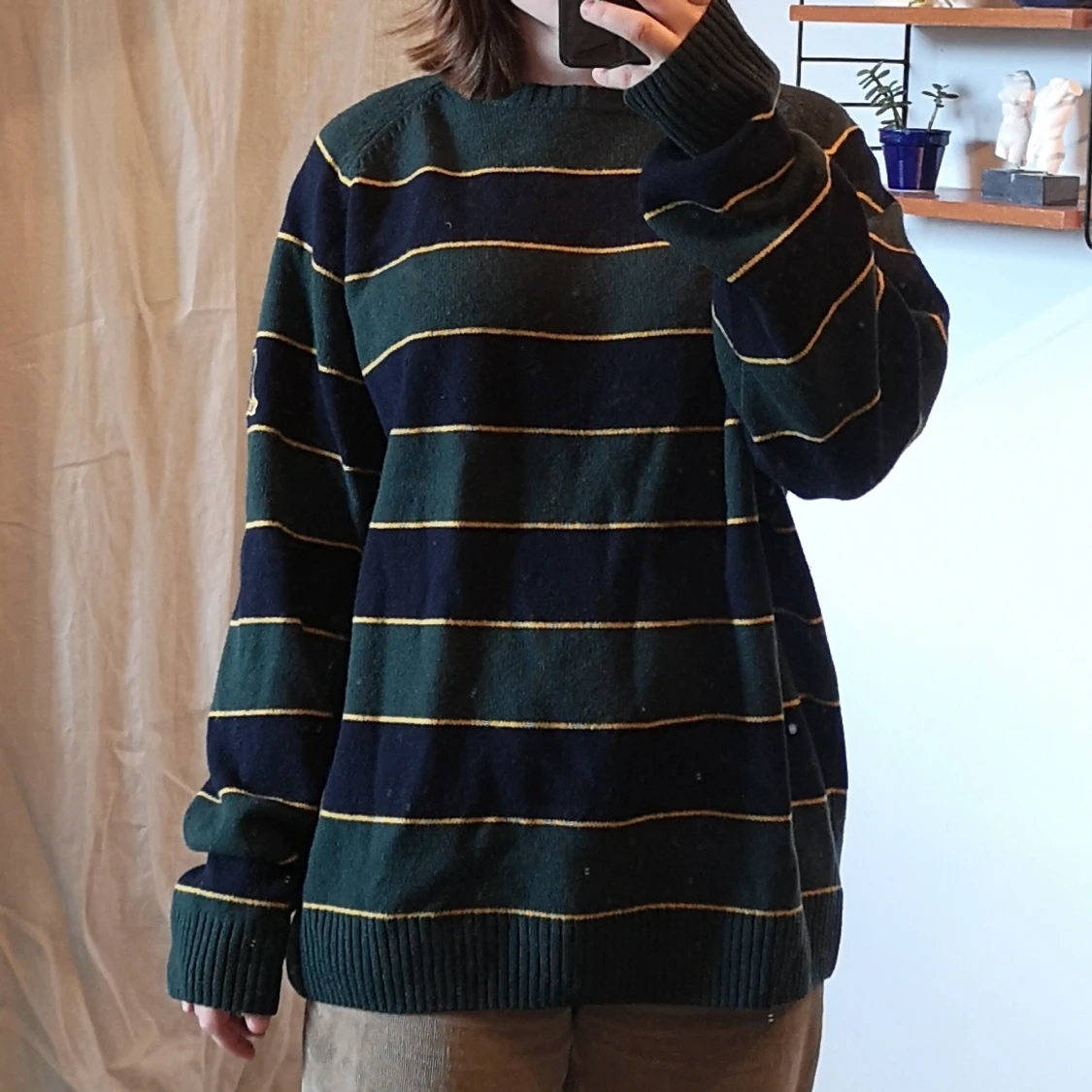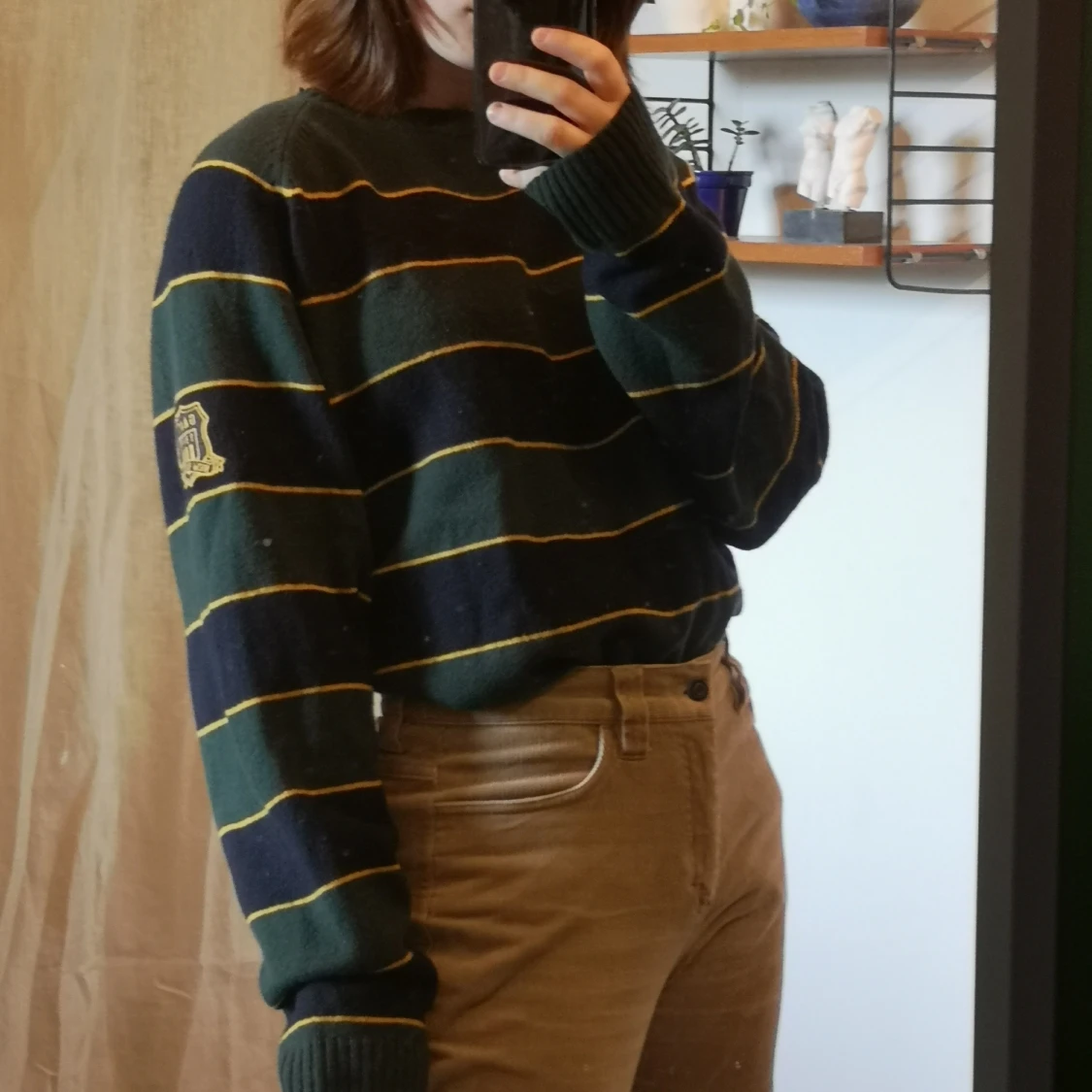 Blå och grön gant tröja i 100% lammull. Några småhål i ärm och krage men inget som stör eller syns mycket. Supersnygg att stoppa in. Jag är 160 och har storlek S/M i vanliga fall.