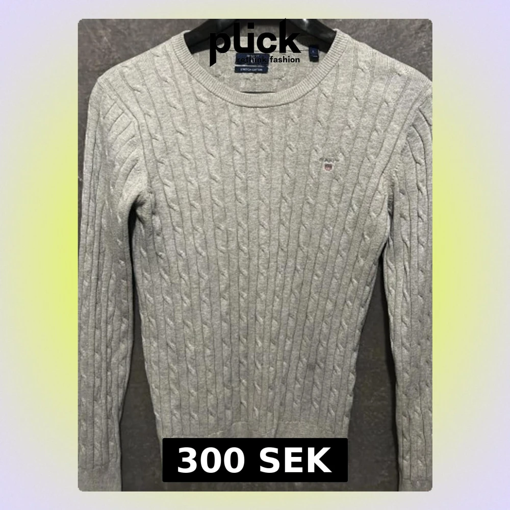 Säljer en grå kabelstickad tröja från Gant med rund halsringning och diskret logga på bröstet. Tröjan är tillverkad i stretchig bomull och har långa ärmar samt ribbade muddar vid ärmslut och nederkant. Perfekt för dig som gillar klassisk och stilren look.