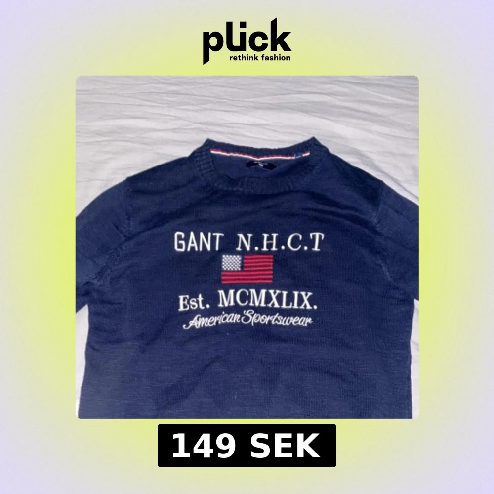 Snygg marinblå stickad tröja från GANT med broderad amerikansk flagga och vit text på bröstet. Tröjan har rund hals, ribbade muddar och klassisk sportig vibe. Perfekt för dig som gillar preppy stil och vill ha något som sticker ut.