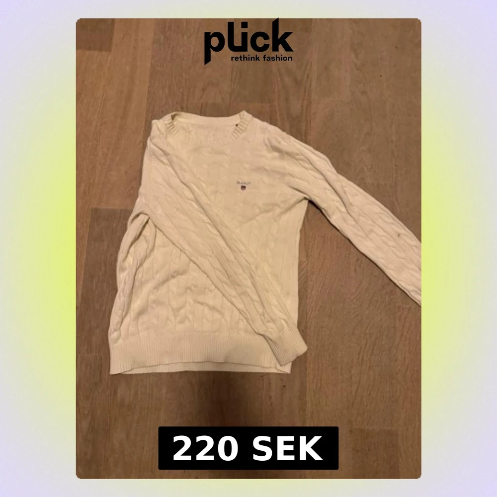 Kabelstickad vit tröja från Gant i storlek XS. Klassisk rund halsringning, broderad Gant-logga med sköld på bröstet och ribbade muddar. Perfekt för lager-på-lager.
