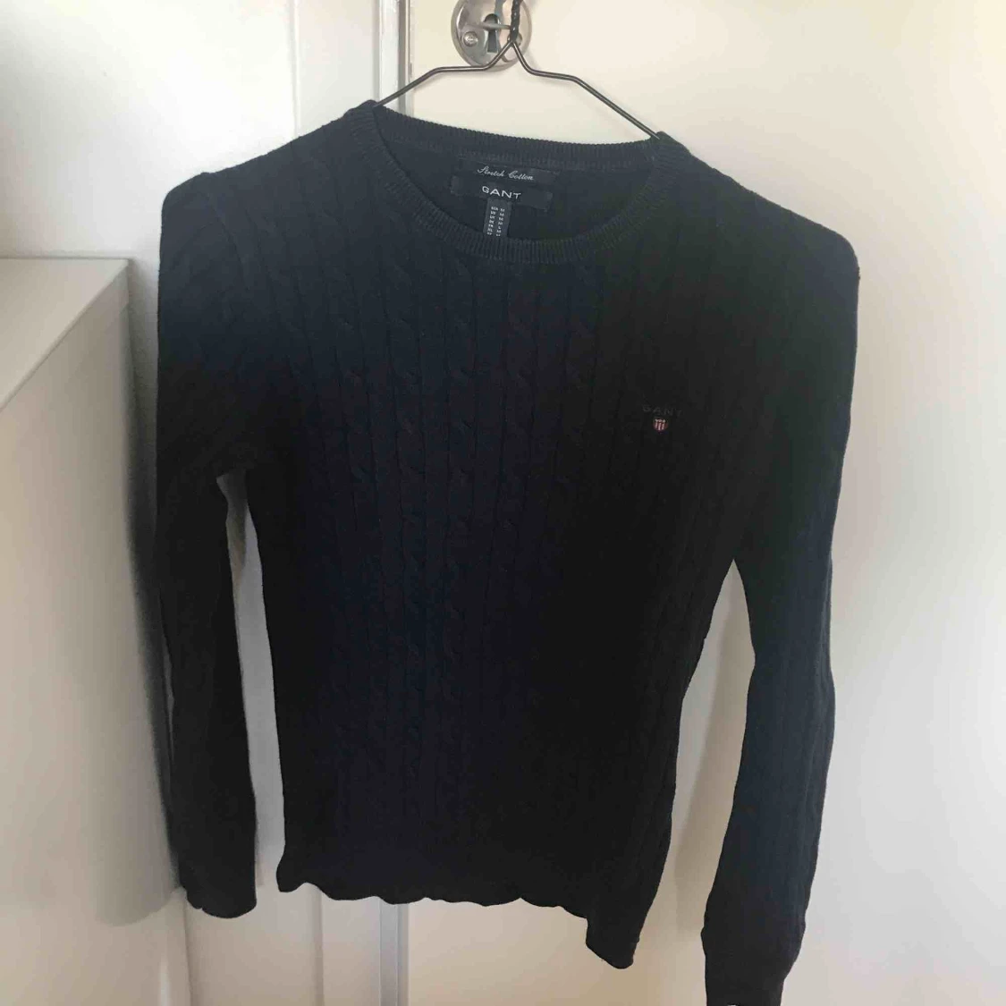 GANT kabelstickad tröja. Använd fåtal gånger därav är den i fint skick. Mörk marinblå i färgen.