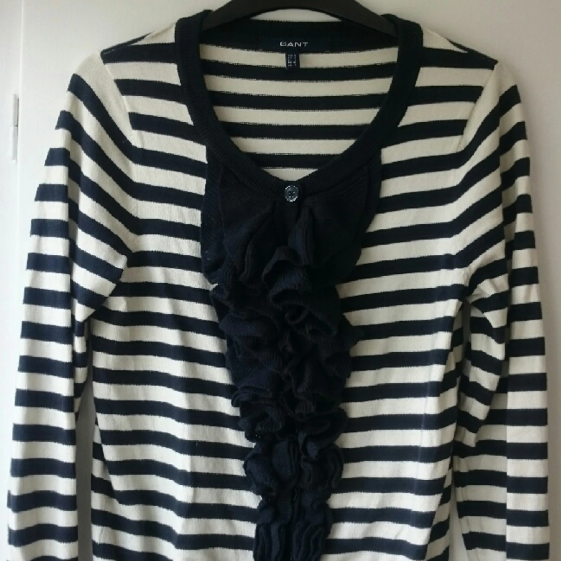 Stickad tröja från Gant i marinblått och vitt. Använd men bra skick! 84% bomull, 9% polyamid, 7% elastan. Stretchig och skön! Passar till mycket, jeans eller kjol. Passar den som har 36-40 o strl. Nypris 1299kr