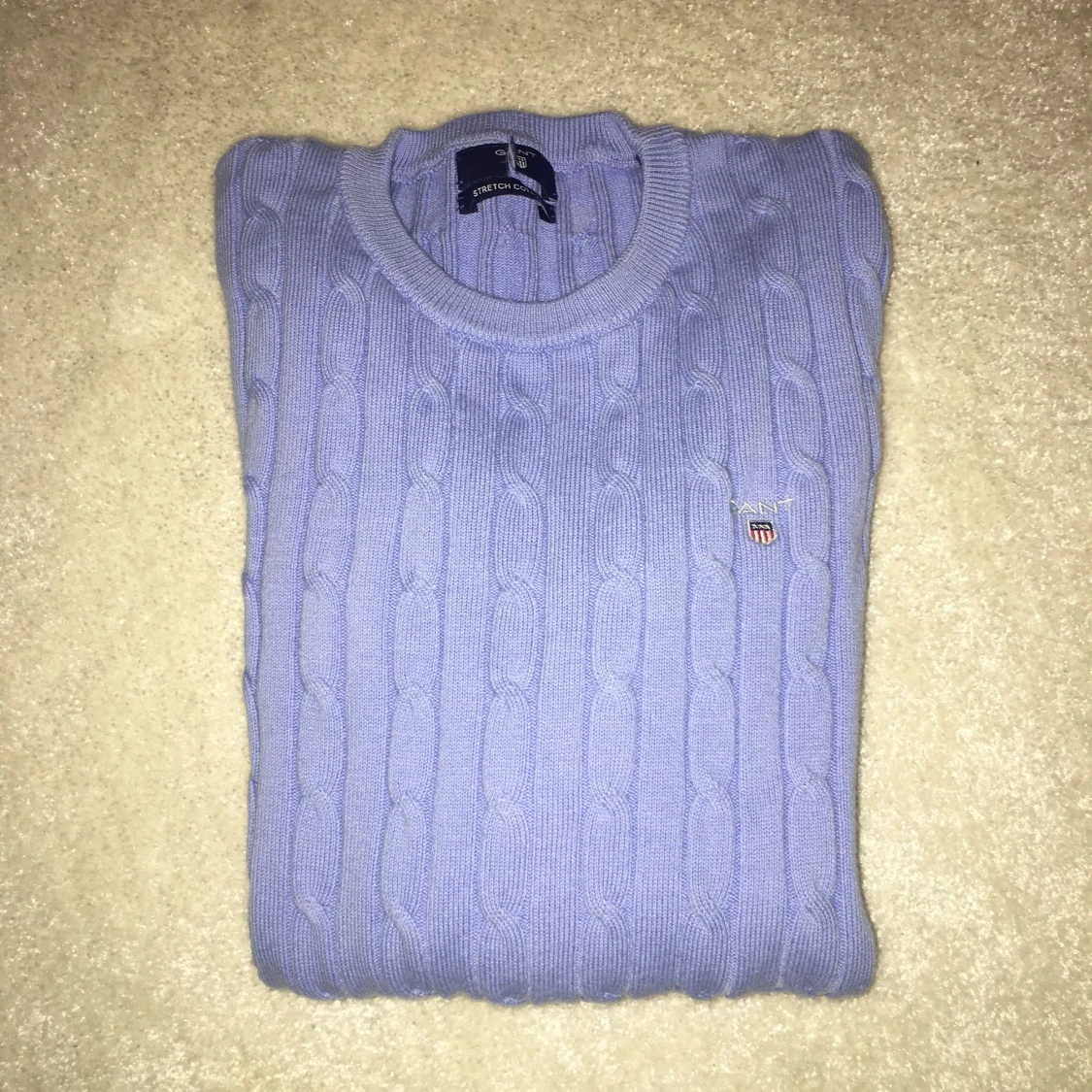 Säljer en ny kabelstickad tröja från GANT i färgen lavenlblå. Endast använd 1 gång.