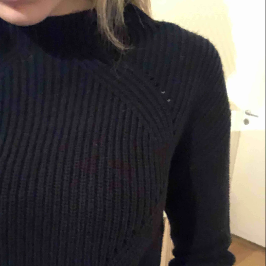 Helt vanlig marinblå stickad tröja köpt på ullared. Vikt i ärmarna som ni ser på bild tre! Frakt tillkommer:)