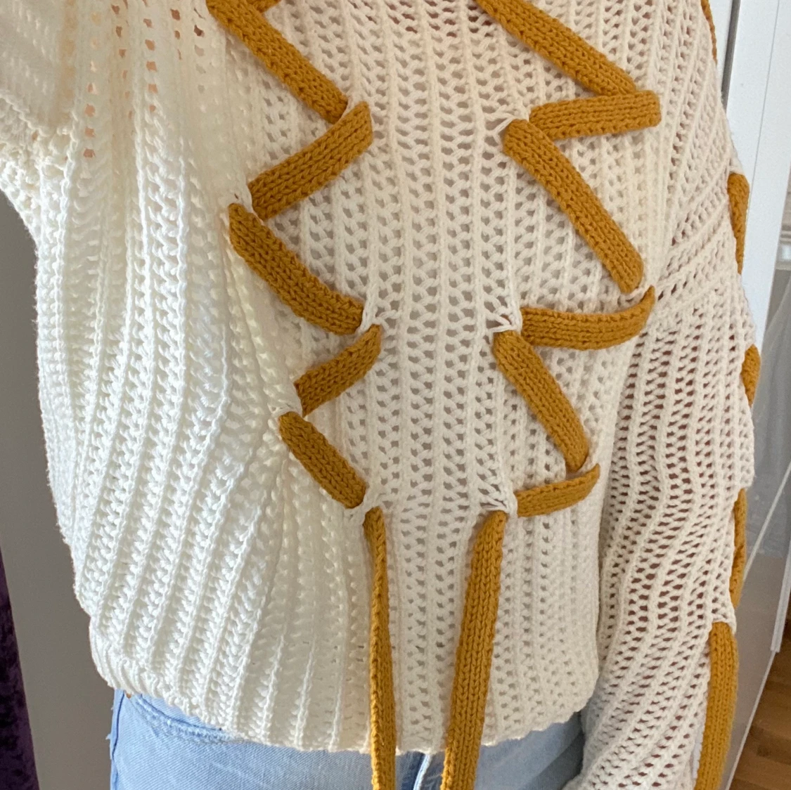 Säljer denna jättefina stickade tröja med gula band från Gestuz. Kommer tyvärr inte till användning länge. Skicket är jättebra. Passar både XS eller S!🌸 Frakt ingår vid högre bud.