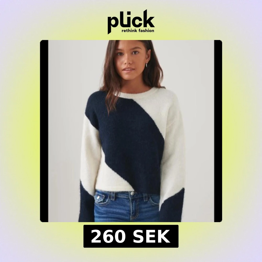 Säljer en stickad tröja med coolt diagonalt mönster i marinblått och vitt från Gina tricot