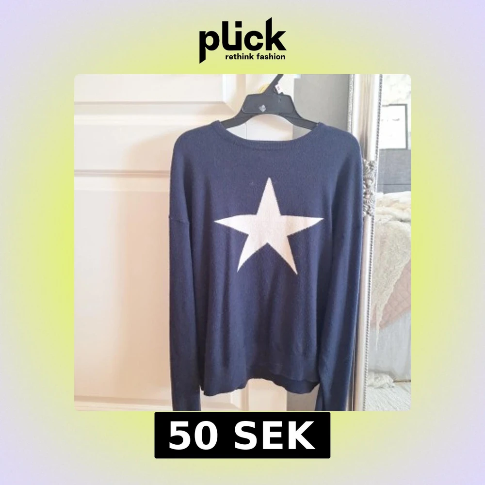 Säljer en mörkblå tröja från Gina Tricot med en stor vit stjärna på framsidan. Tröjan har långa ärmar och en rund halsringning. Perfekt för en avslappnad stil. 🟦⭐