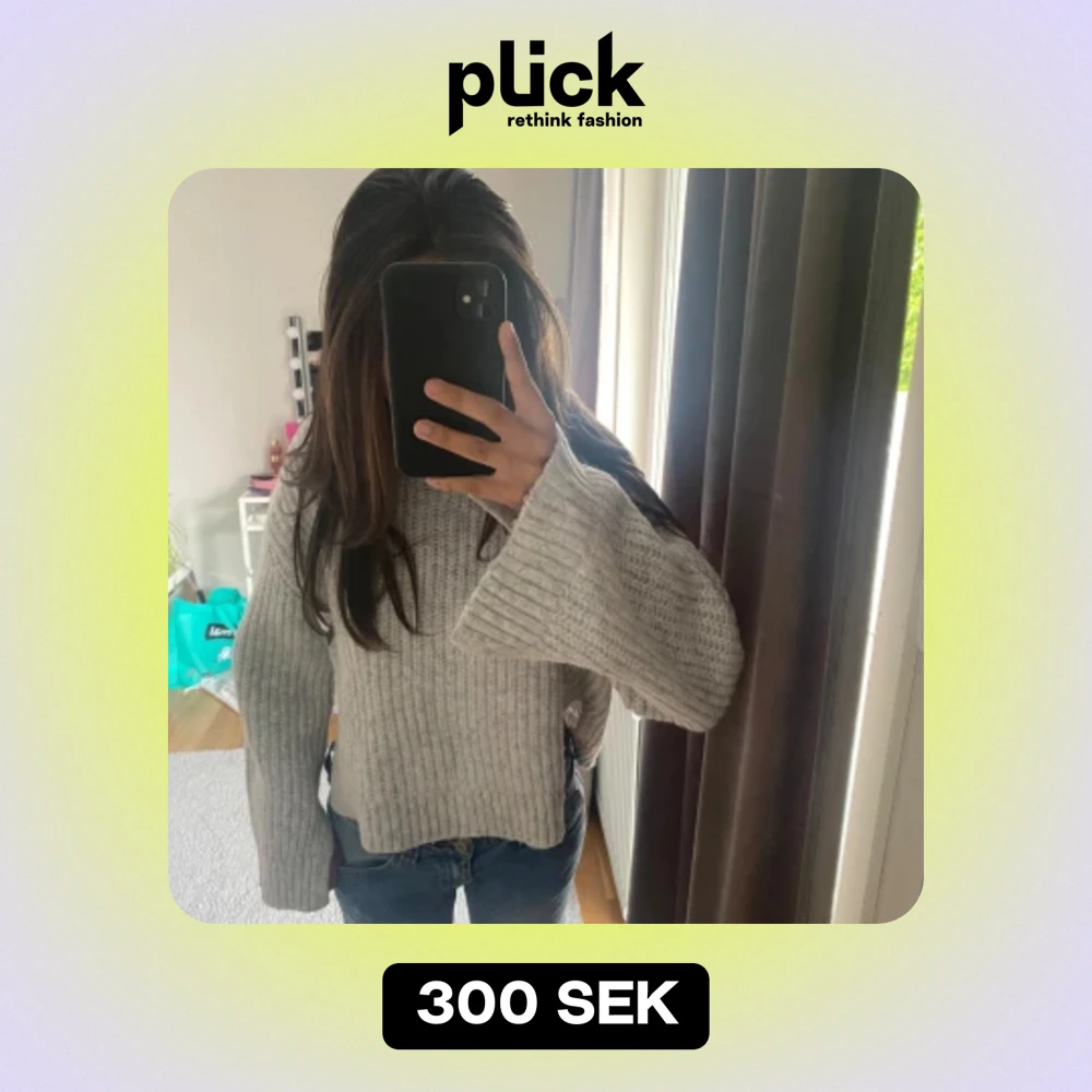 Säljer denna gråa fina stickade tröjan ifrån gina tricot, den är använd få gånger så i fint skick! Den är vid i armarna med slit i armarna och i sidorna på tröjan.