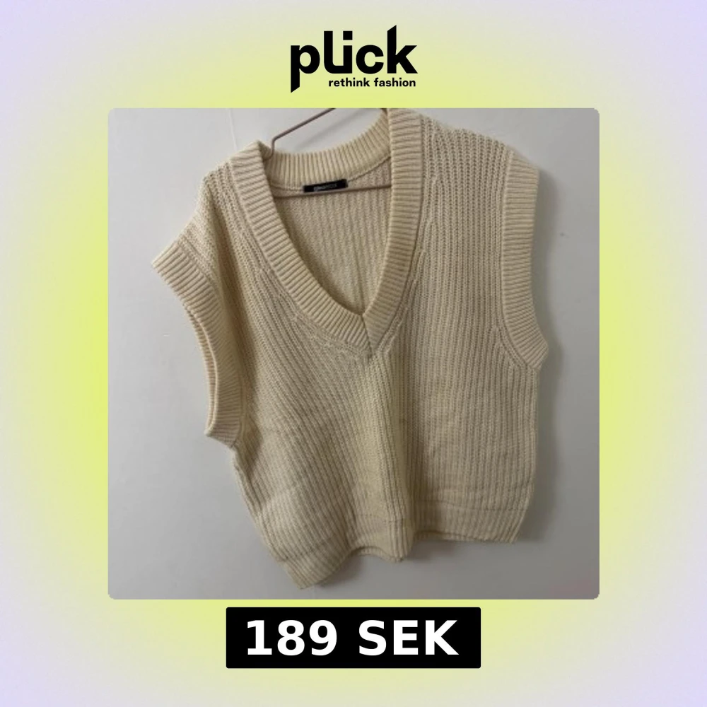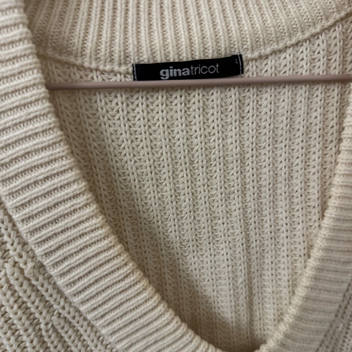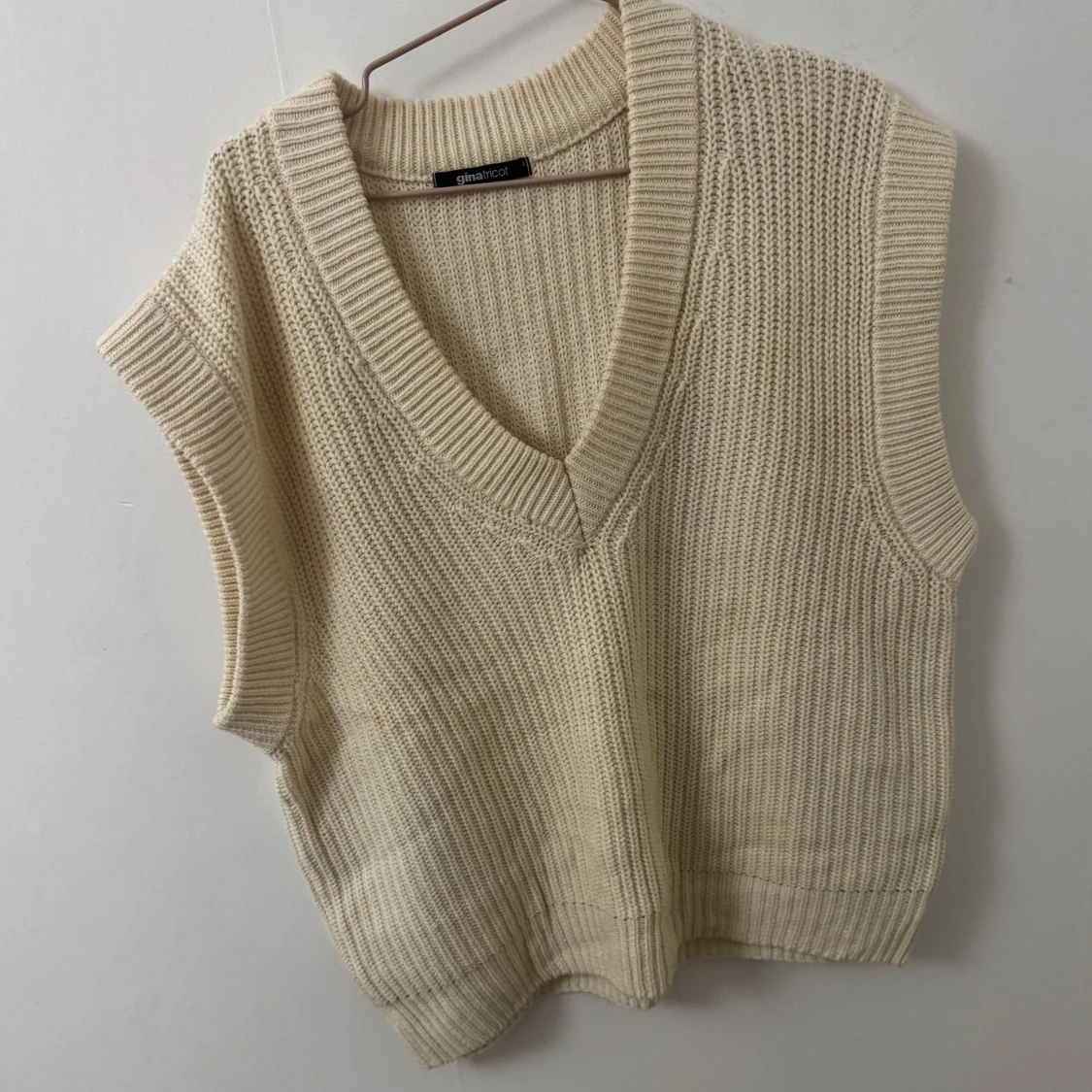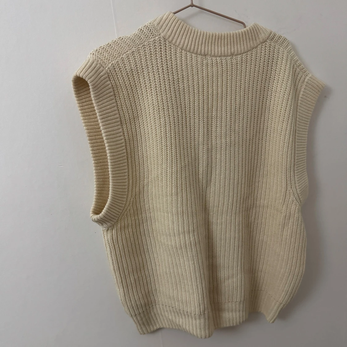 Beige stickad väst från Gina Tricot med bred ribbad v-ringning och grovstickad struktur. Modellen är ärmlös och har en avslappnad passform, perfekt att slänga över en skjorta eller t-shirt för en trendig lager-på-lager-look. Den är i storlek L för att jag ville ha den pösig, då jag tycker att det är finare med oversize look just på dessa typer av tröjor.