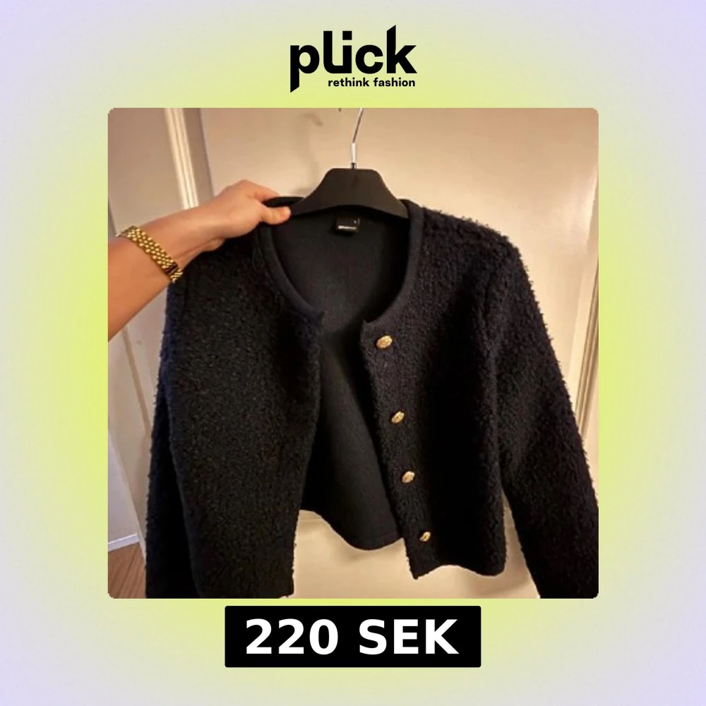Säljer en svart kofta från Gina Tricot med snyggt strukturstickat material och dekorativa guldknappar framtill. Koftan har rund halsringning och långa ärmar, perfekt för lager-på-lager och en stilren look.