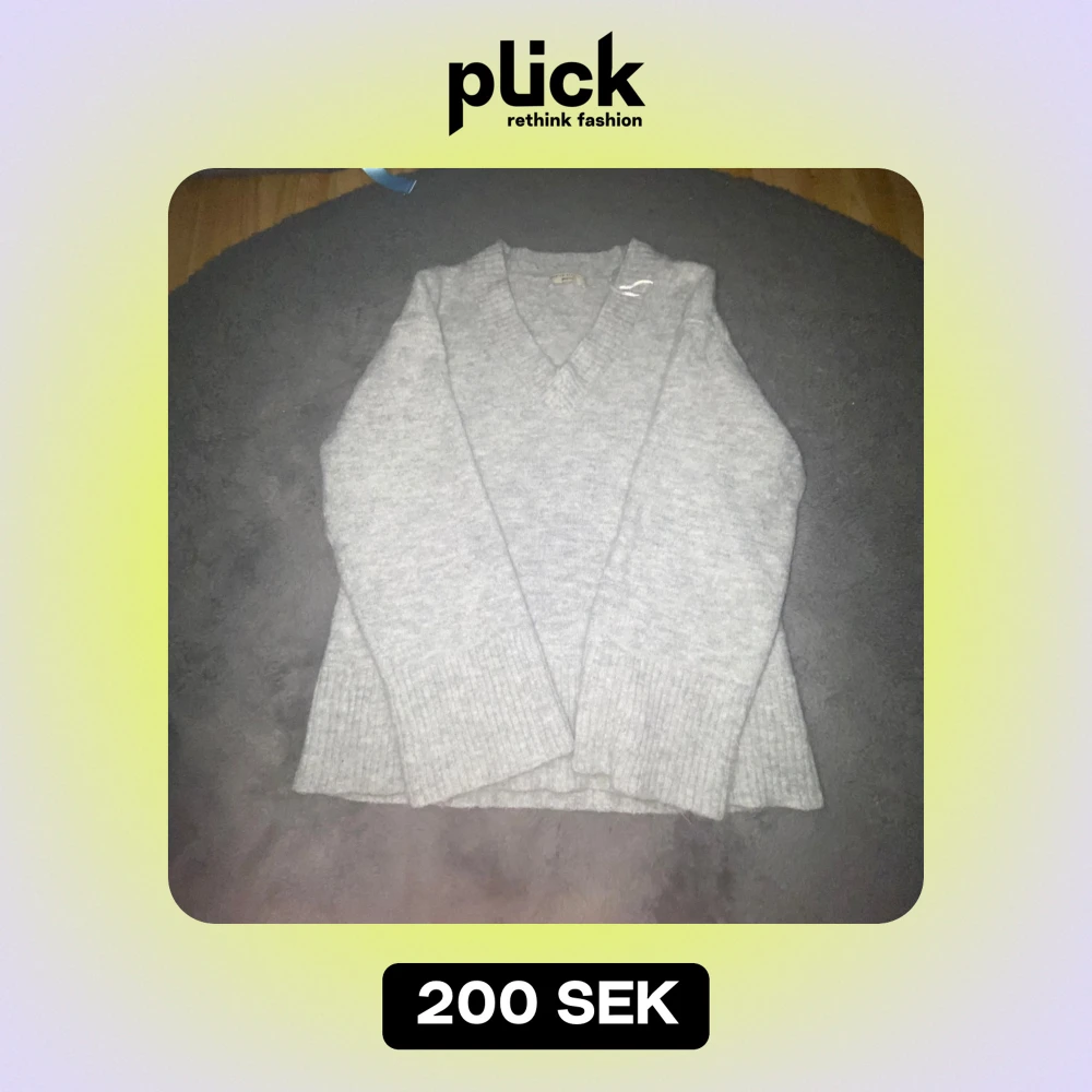 Mysig grå stickad tröja från Gina Tricot i storlek S. Perfekt för kyliga dagar med sin varma och bekväma passform. Tröjan har en v-ringad hals och långa ärmar, vilket gör den idealisk för både vardag och mysiga hemmakvällar. Aldrig använt men ingen prislapp kvar tyvärr.