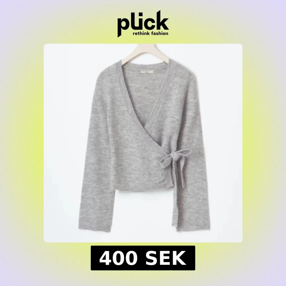 Mysig grå omlottkofta från Monki med knyt i sidan och v-ringad hals. Koftan är stickad och har långa ärmar, perfekt för lager på lager. Enkel och stilren design som passar till många outfits.