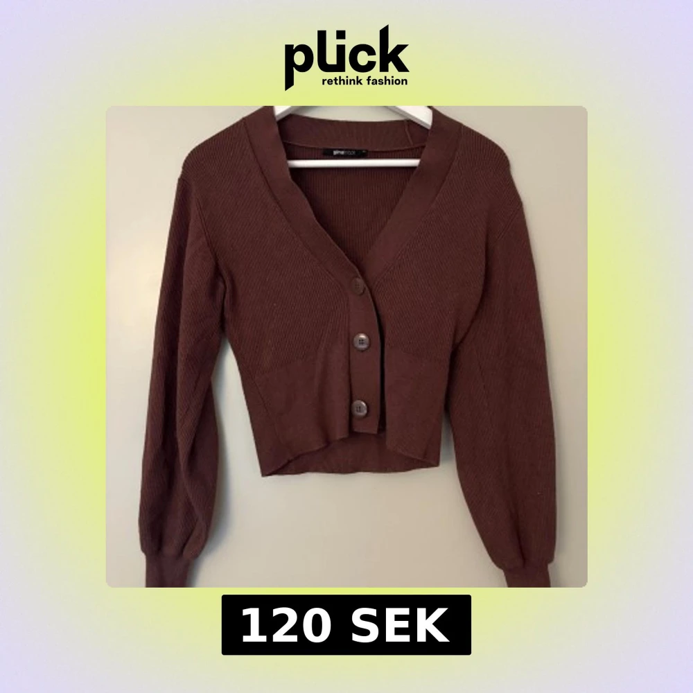 Säljer en brun croppad kofta från Gina Tricot med v-ringning och stora knappar framtill. Koftan är ribbstickad och har långa ärmar med breda muddar. Perfekt att slänga över en topp för en chill look. Använd fåtal gånger.