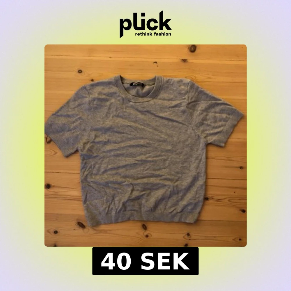 En basic grå stickad tröja från Gina Tricot i storlek S. Tröjan har rund halsringning, korta ärmar och ribbade muddar vid hals, ärmslut och nederkant. Perfekt för lager-på-lager och enkel att matcha med allt.