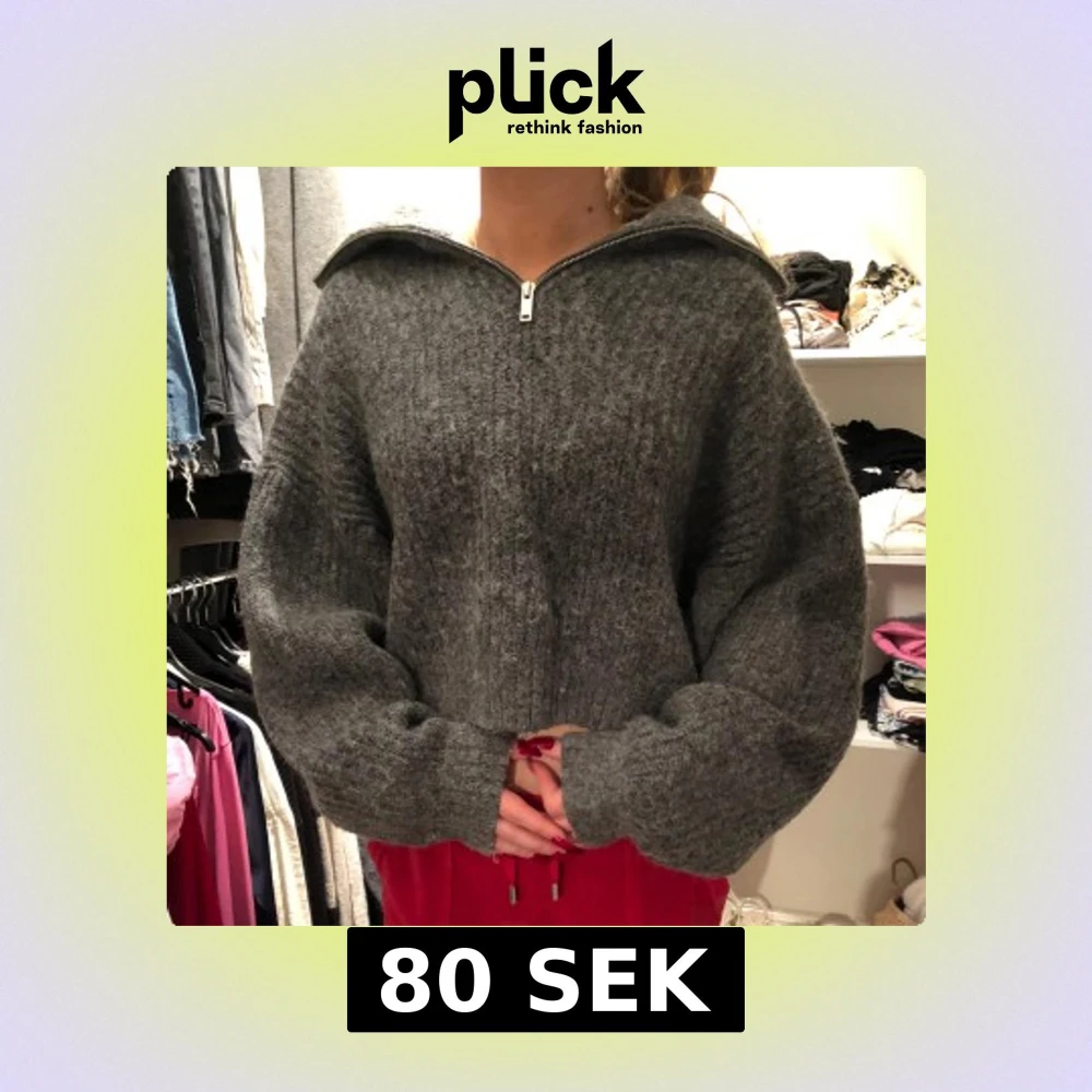 Mysig grå stickad tröja med dragkedja och hög krage. Perfekt för kyliga dagar med sin croppade design och långa ärmar. En stilren och bekväm tröja för alla tillfällen.