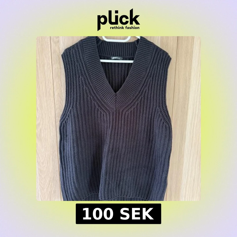 Säljer en svart, grovstickad väst från Gina Tricot i storlek XS. Västen har en djup v-ringning och bred ribbad kant runt halsen. Perfekt att slänga över en skjorta eller t-shirt för en chill och trendig look.