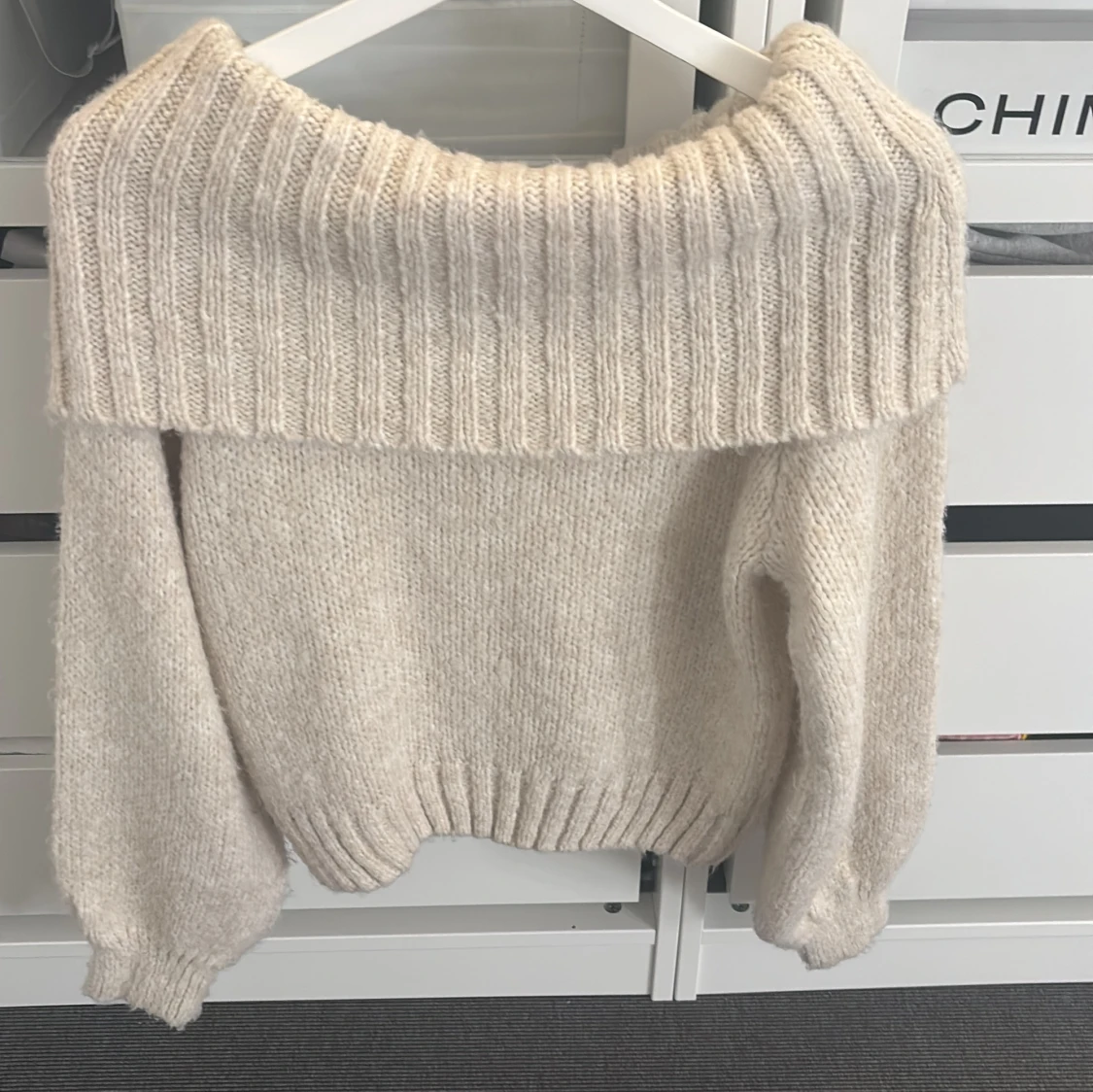 Superfin beige stickad tröja med offshoulder-design. Perfekt för höst och vinter, den är både mysig och stilren. Tröjan har långa ärmar och en bred ribbad kant som ger en extra touch. Passar perfekt till både jeans och kjol för en avslappnad men chic look.