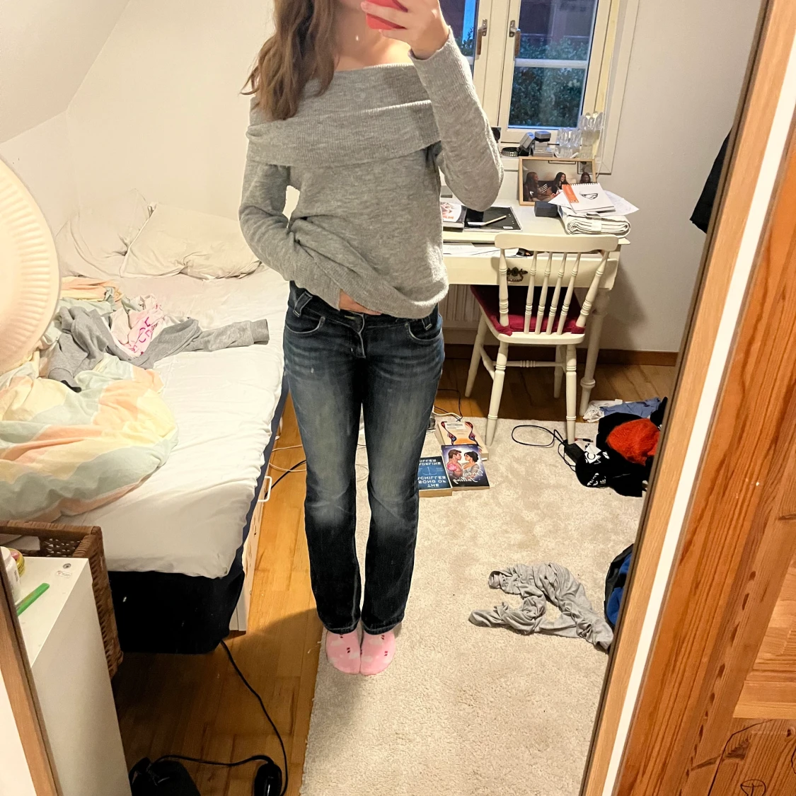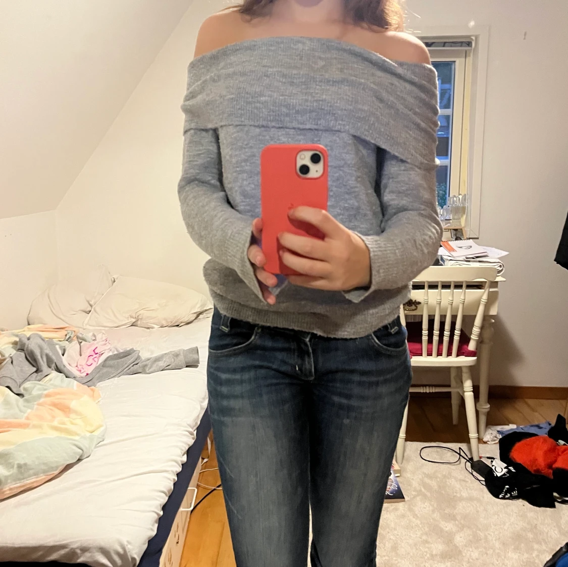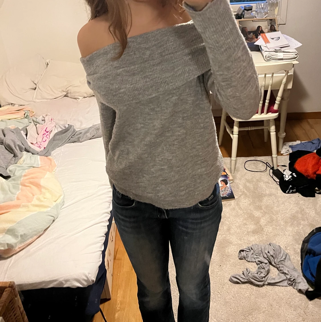Jättefin grå stickad off the shoulder.