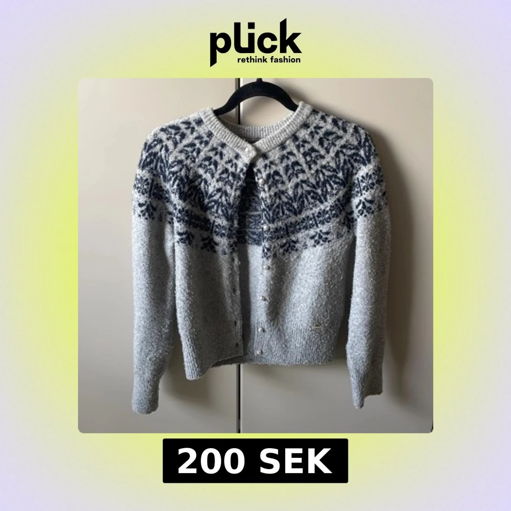 Säljer en mysig grå kofta från Holly & Whyte med ett vackert mönster i mörkblått runt oket. Koftan har långa ärmar och knäpps med knappar framtill. Perfekt för kyliga dagar!