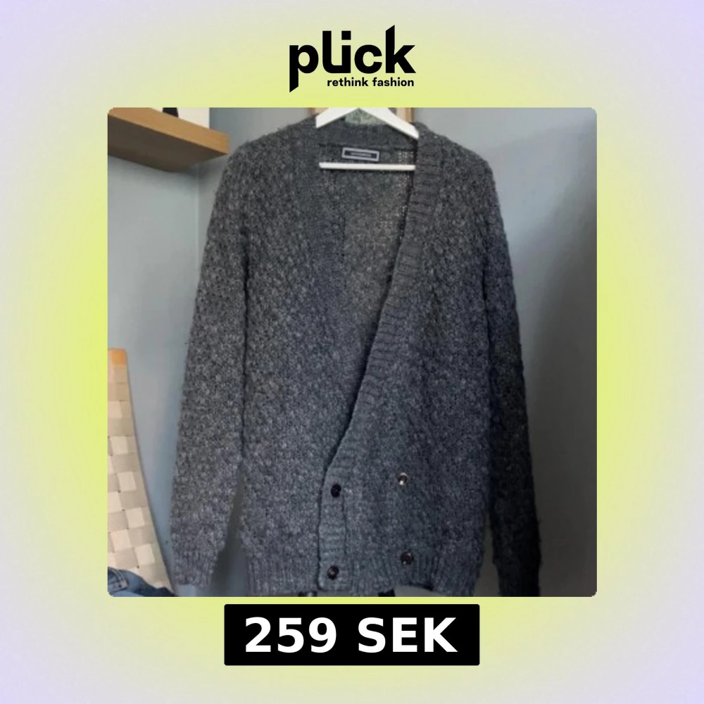 Säljer en mysig grå cardigan från Quintessence. Den är stickad med en blandning av akryl, ull, alpacka och viskos. Koftan har en djup v-ringning och knappar framtill. Skick 8/10 stolek S/M.