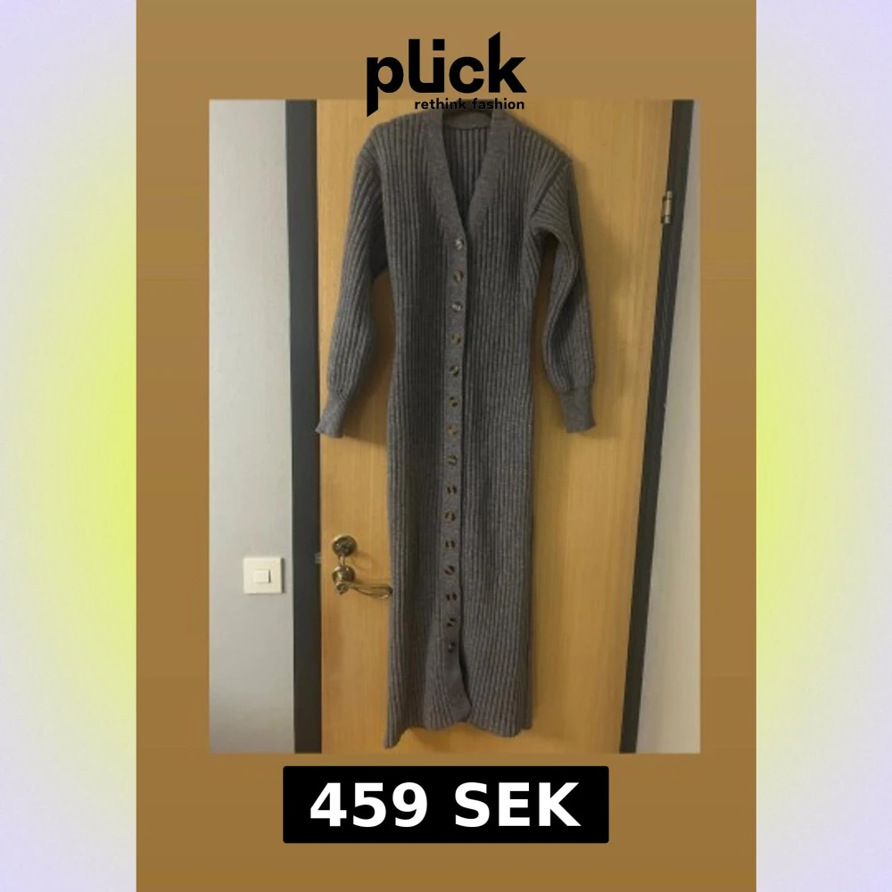 Säljer en lång, ribbad stickad klänning i grå färg med v-ringning och knappar hela vägen framtill. Klänningen har långa ärmar och är stickad i ett mjukt material som ger en chill och cozy vibe. Den går även att knäppa upp och ha som kofta. En väldigt stretchig klänning som funkar i större strlk än bara M