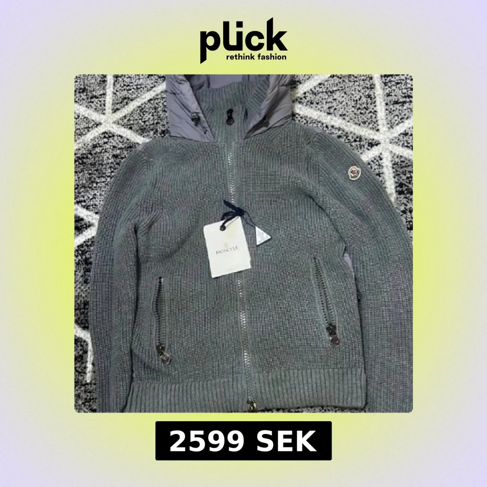 Snygg grå pufferjacka från Moncler med stickade ärmar och ribbade muddar. Jackan har quiltad baksida och huva i glansigt material, samt två fickor med dragkedja framtill. Moncler-logga på ärmen och diskret etikett på insidan. Perfekt för kyliga dagar. Storlek L men sitter som en M/S