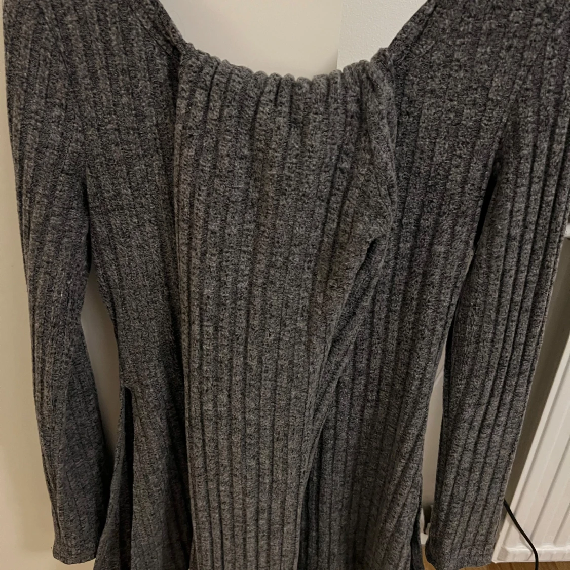 Snygg grå ribbad tröja med lång ärm med byxor. Perfekt för kyligare dagar med sin stickade look och bekväma passform. Slits vid sidorna av tröjan.