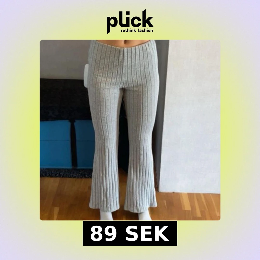 Snygga grå ribbade byxor med hög midja och utsvängda ben. De är otroligt mjuka och sköna. De har väldigt hög midja (på bilden är de nedvikta en gång) och normala i längden. Jag är 170cm, och de är för korta för mig. Passar nog 160-165cm perfekt!🩶