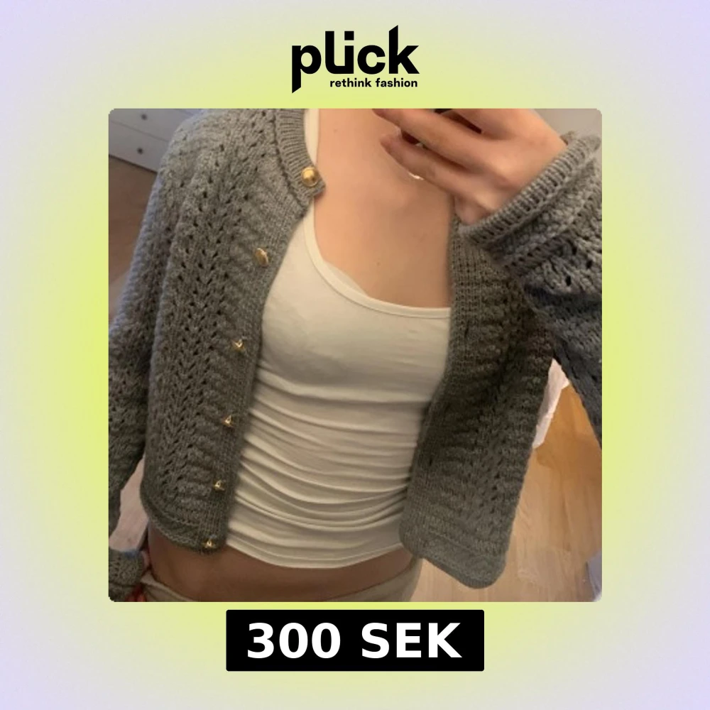 Säljer en snygg grå stickad kofta från H&M. Koftan har ett fint hålmönster och knäpps med guldknappar framtill. Den är tillverkad av 65% återvunnen akryl och har långa ärmar. Perfekt för att hålla sig varm och stilren. (Bara provad ett par gånger, annars har den hängt i garderoben pga att den inte riktigt är min stil⭐️