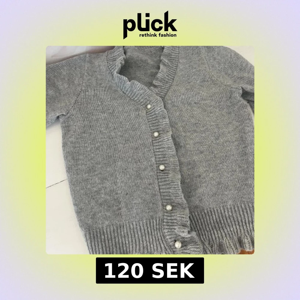 Superfin grå stickad kofta med volangkant och pärlknappar framtill. Koftan har långärmade ärmar och ribbade muddar vid ärmslut och nederkant. Knappt använd!