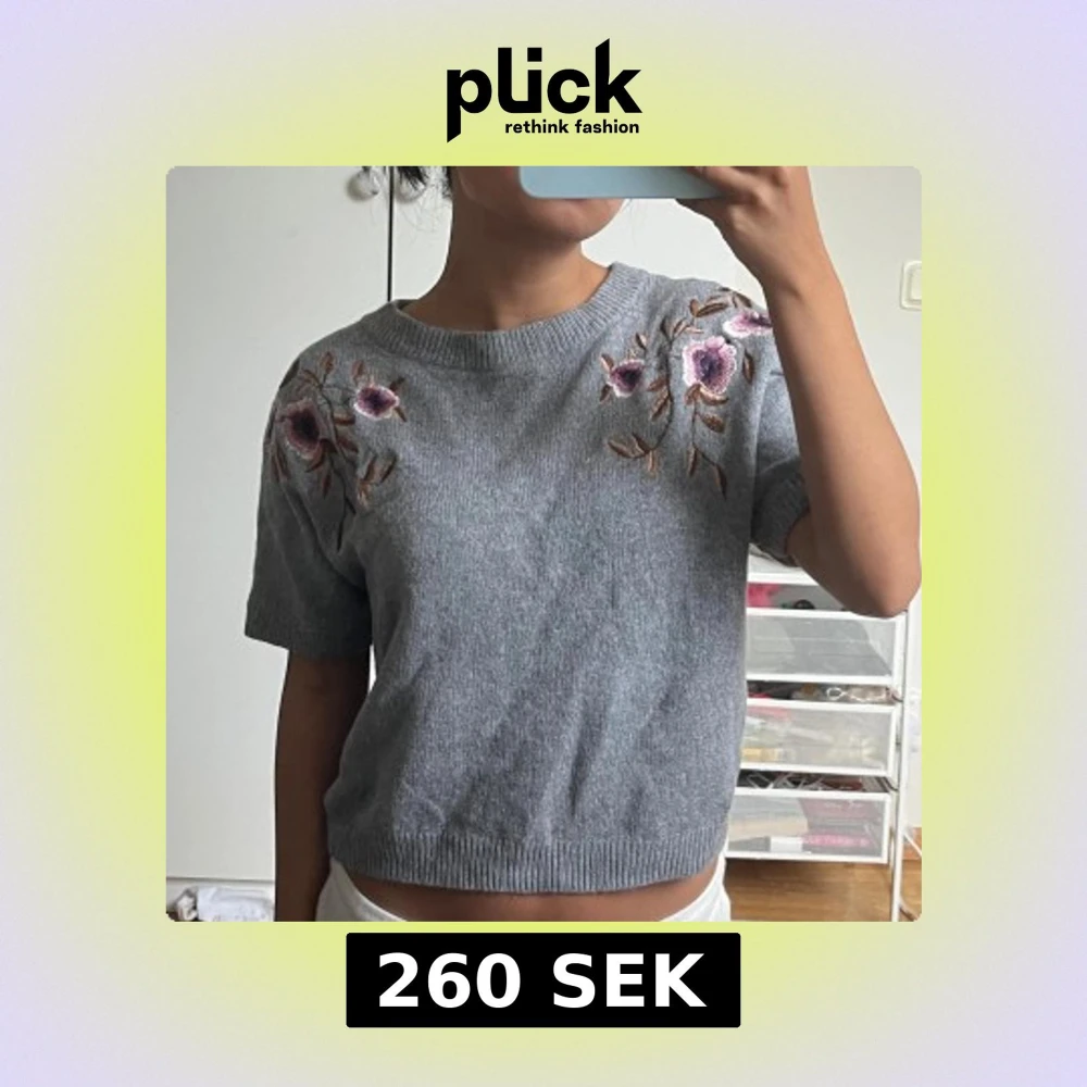 Superfin grå stickad topp från Massimo Dutti med broderade blommor i lila och rosa på axlarna. Knappt använd!