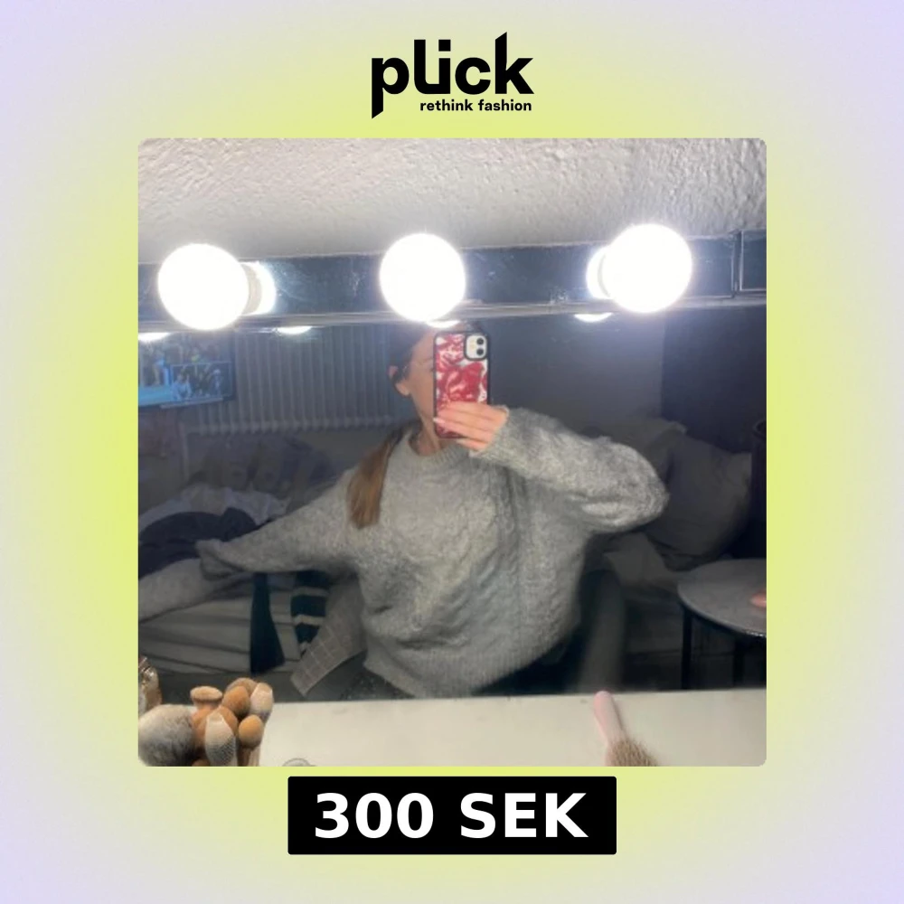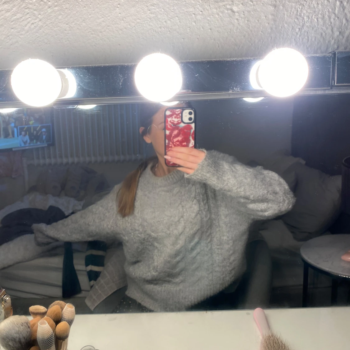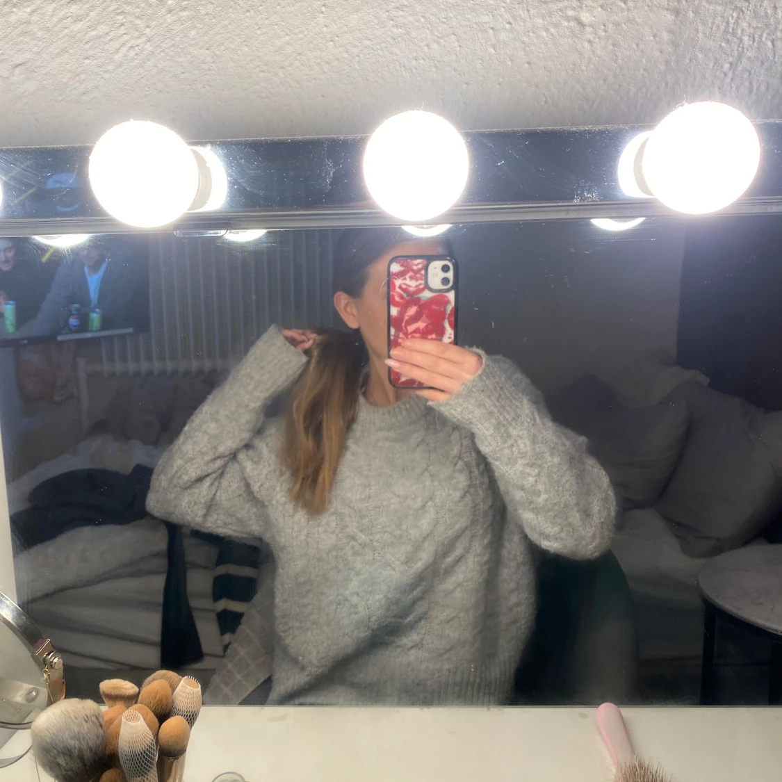 Jättemysig grå stickad tröja och är lite oversized för mig. Inte alls stickig, den är väldigt varm och är perfekt för kalla dagar. Använd bara några få gånger. Köpt från Gina young i storlek 146/152. Skulle säga att den är mellan S-M