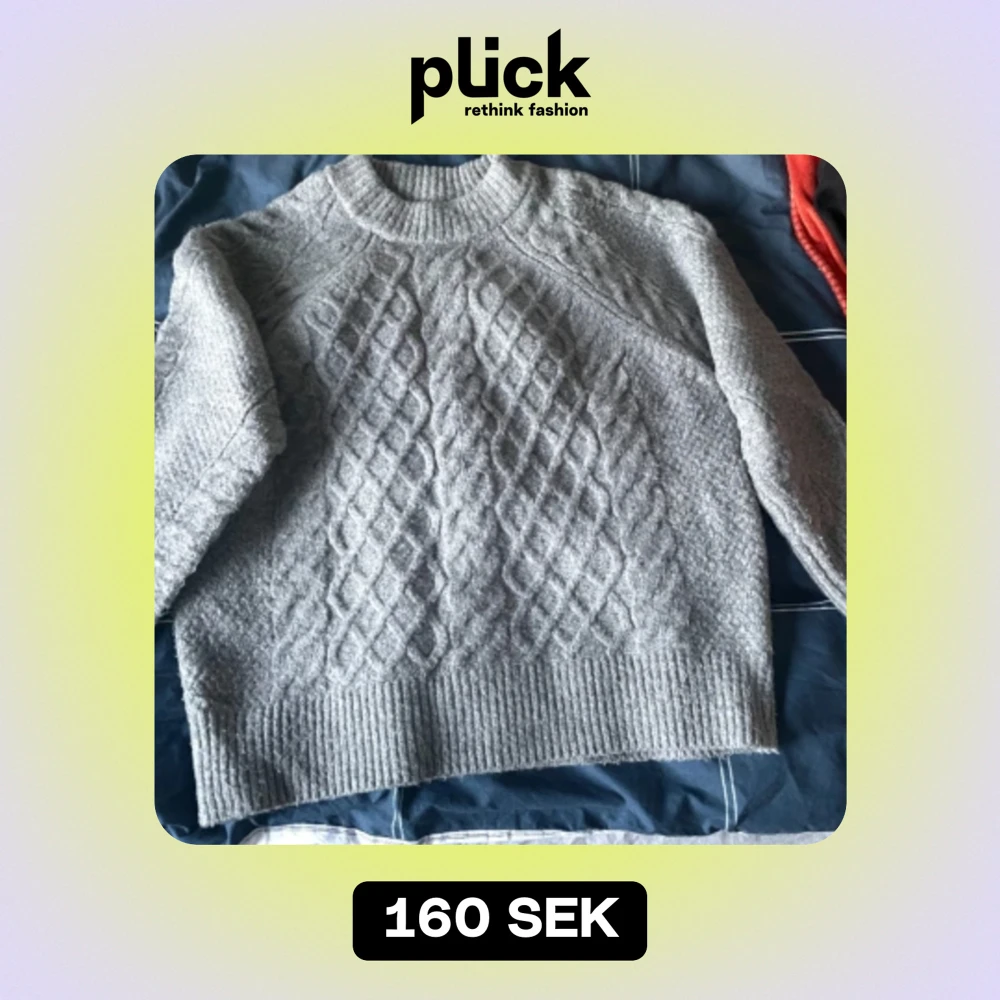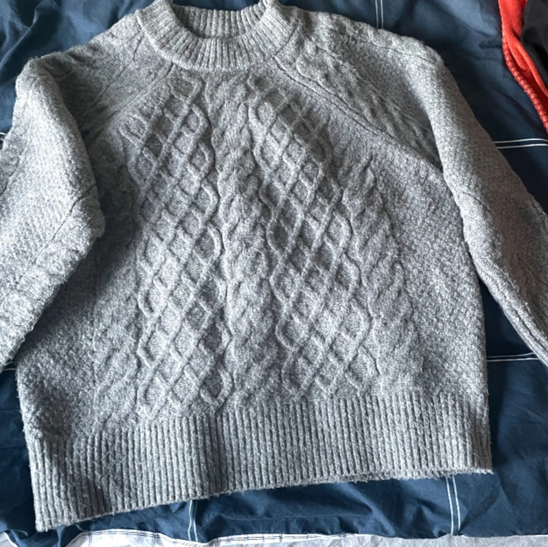 Grå tjock stickad tröja med mönster på framsidan som ej kommit till användning. Använd ett fåtal gånger men i väldigt bra skick. Tröjan är i storlek xs men är som en Large eller Medium.