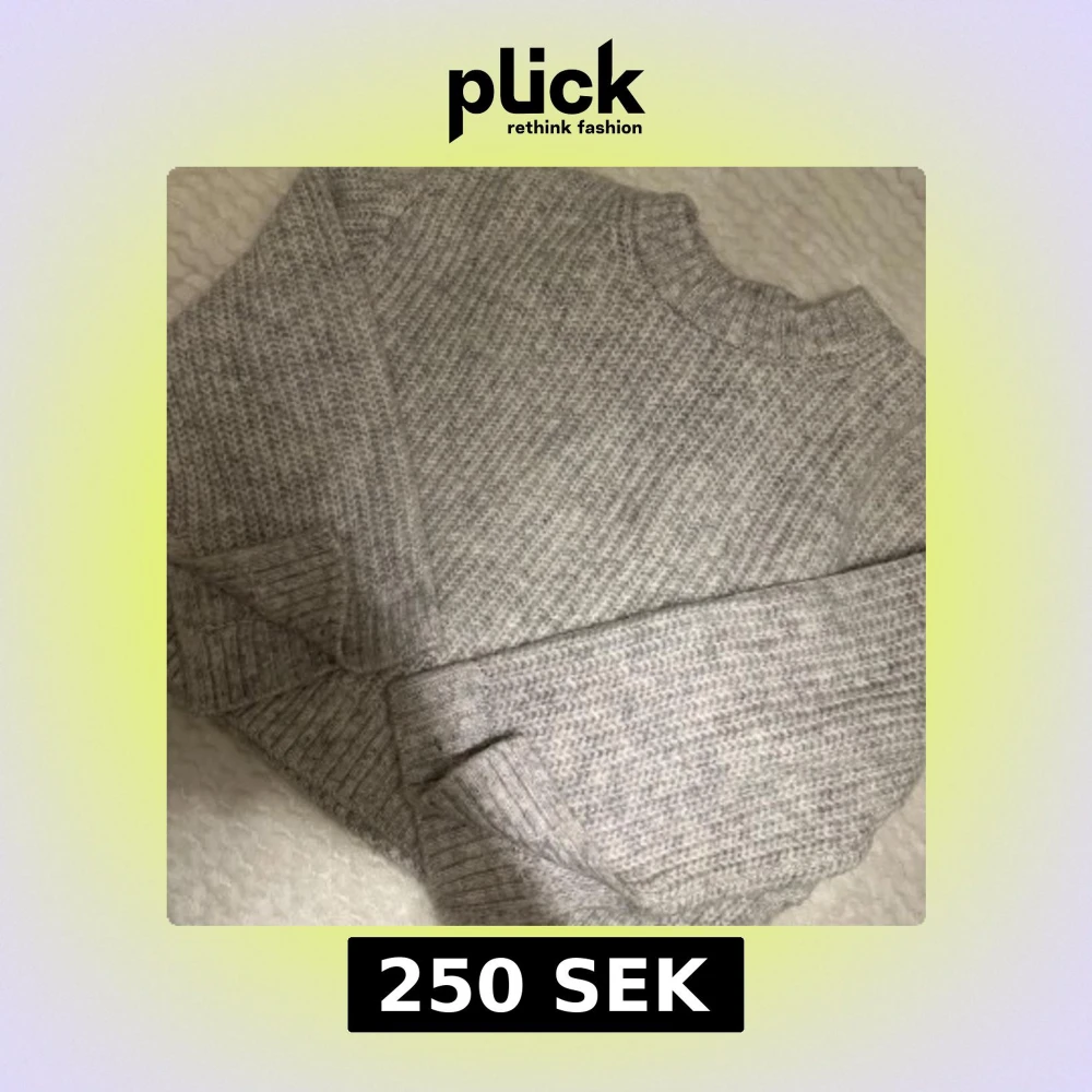 Mysig grå stickad tröja med ribbade muddar vid ärmslut och nederkant. Storlek S och köpt på Ginatricot, aldrig använd