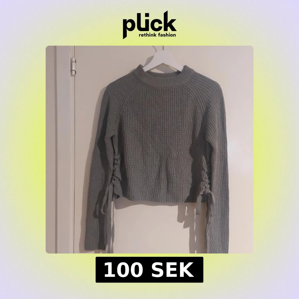 Grå stickad tröja från Even&Odd i storlek XS. Tröjan har lång ärm, ribbad struktur och cool snörningsdetalj längs sidorna. Snörningen går att knyta om om man vill. Rund halsringning och en lite mer croppad passform.