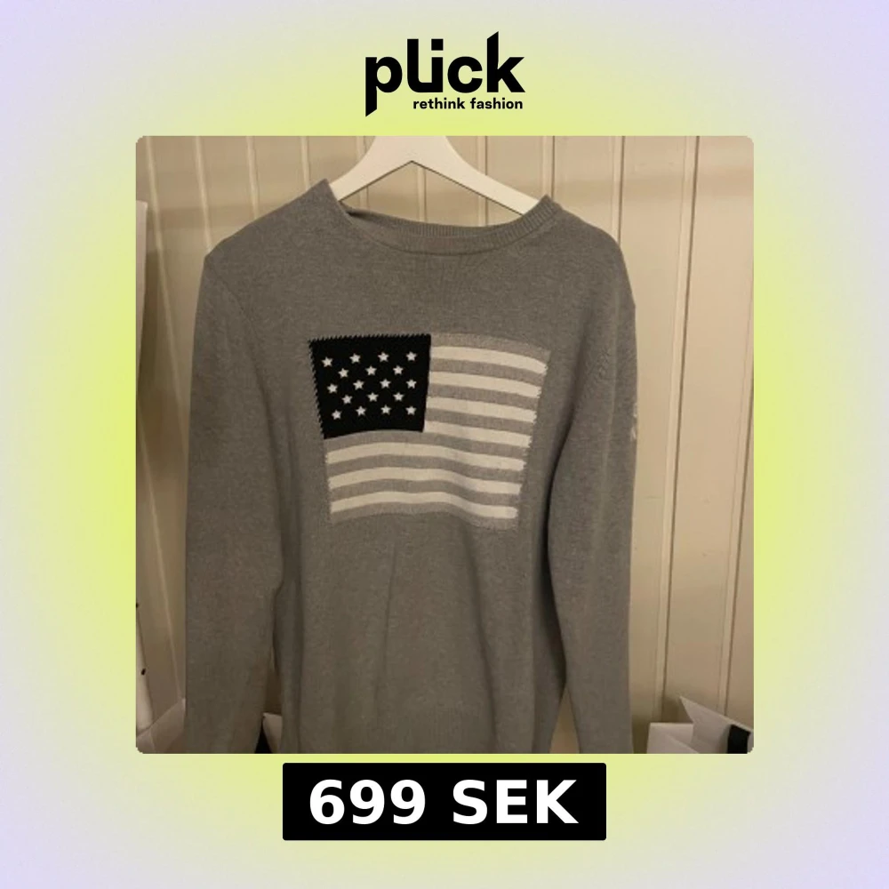 Snygg grå stickad tröja från GANT med amerikansk flagga i svart och vitt framtill. Tröjan har rund halsringning och långa ärmar, perfekt för dig som gillar klassisk men ändå cool stil.